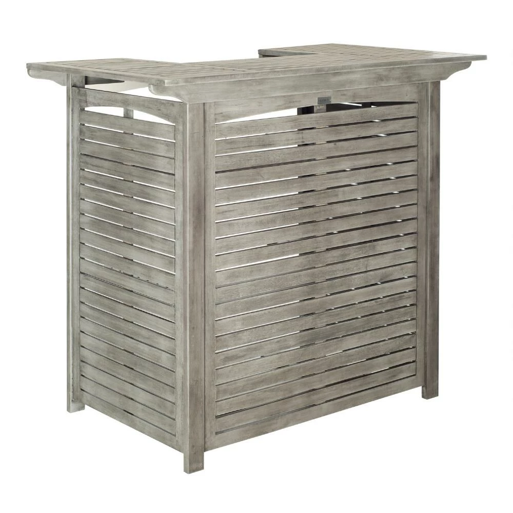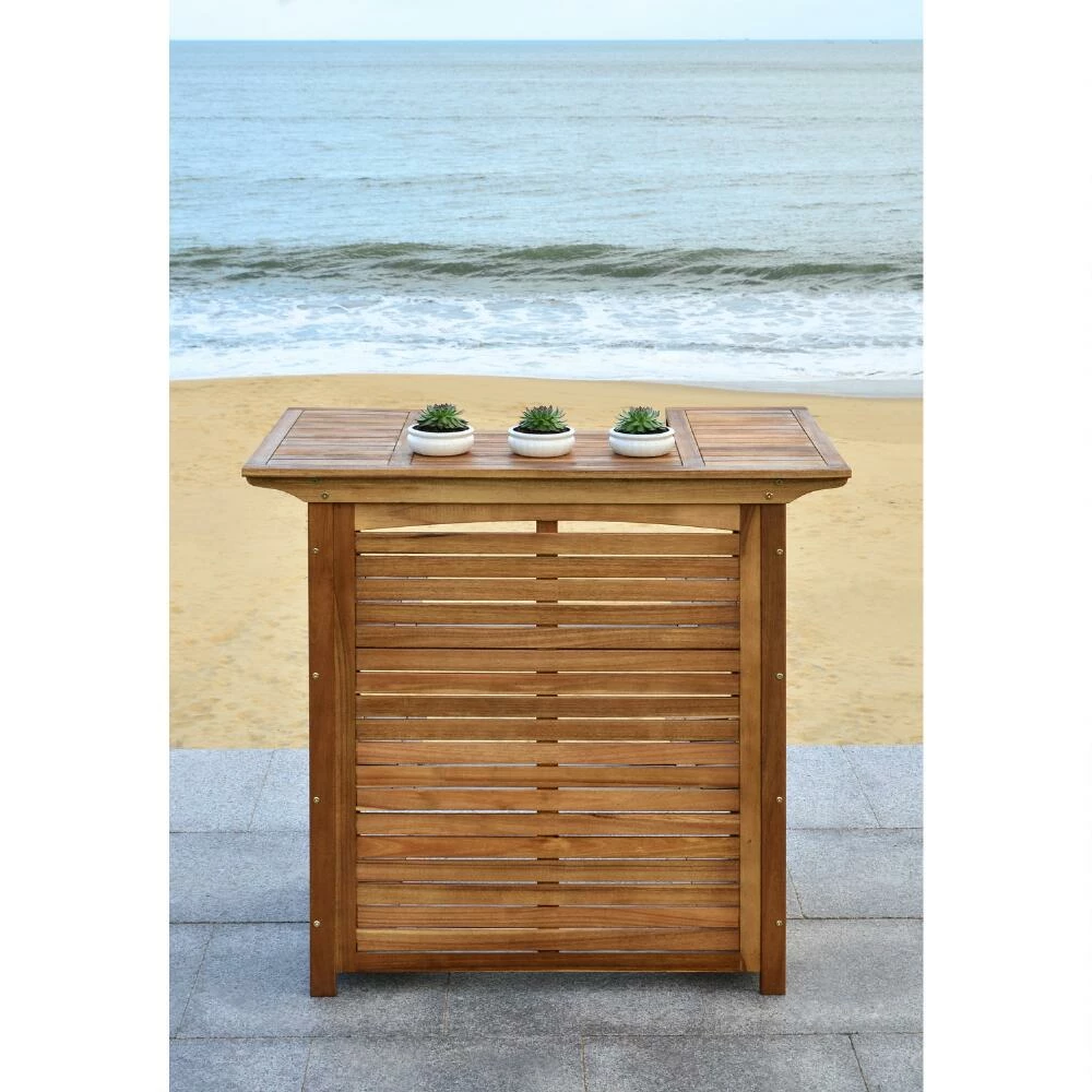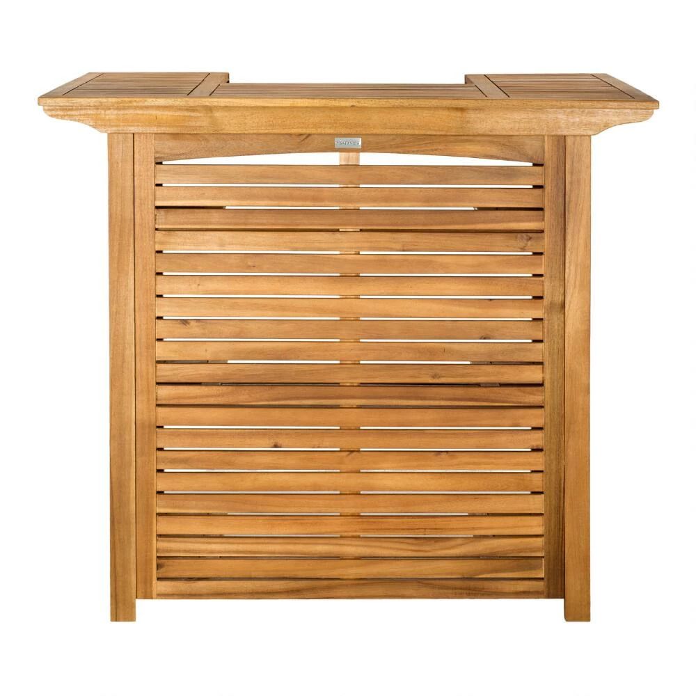 Made of durable acacia wood to withstand the elements, the Herrin outdoor bar table tucks away three storage shelves behind its eye-catching slatted exterior. Featuring a cutout center that angles around the bartender, this patio pub table organizes wine bottles, cocktail mixers and glassware within easy reach. Paired with your favorite barstools it becomes the perfect place to greet guests during the patio or poolside party.