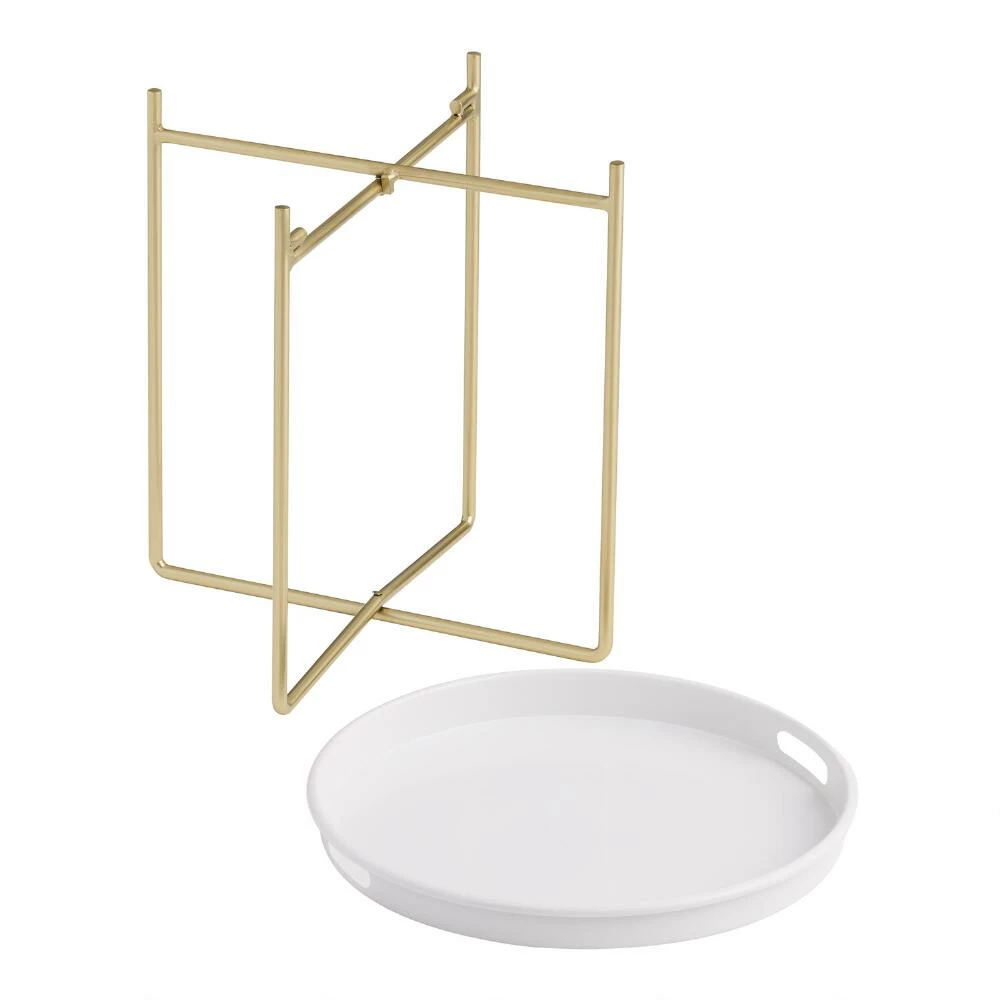 Crafted of powder-coated steel to weather the elements, our Adelmo outdoor folding table features an elegant white tray top above U-shaped legs in glam gold. A two-tone patio table for effortless entertaining, it’s lightweight with two cutout handles for maximum portability. Perfect for moving from the kitchen to your outdoor space to serve drinks and snacks, its sleek legs fold for easy storage when not in use.
