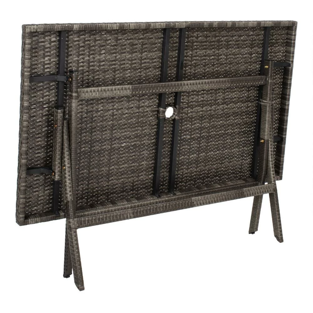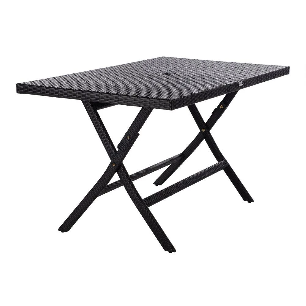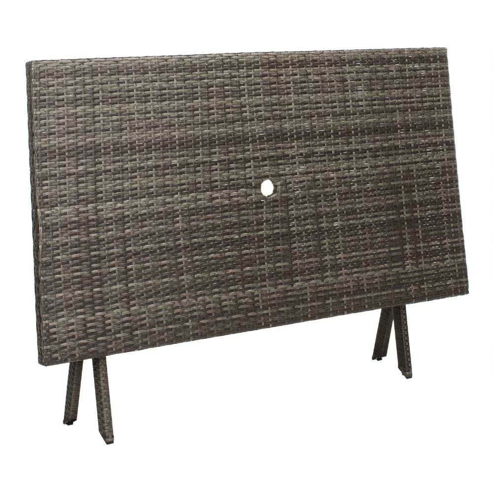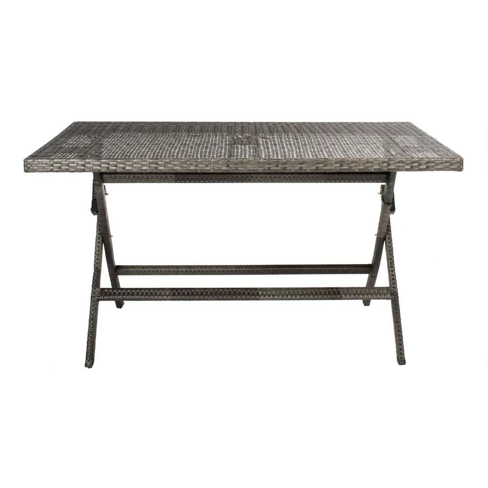 Woven of durable all-weather wicker, the Afton outdoor folding table features a rectangular tabletop that folds up for vertical storage when not in use. A compact patio table for alfresco entertaining, it’s perfect for backyard barbecues, parties or transporting to gatherings and get-togethers. Available in a choice of neutral hues, it’s central cutout holds your favorite patio umbrella for extra decorative flair and protective shade.