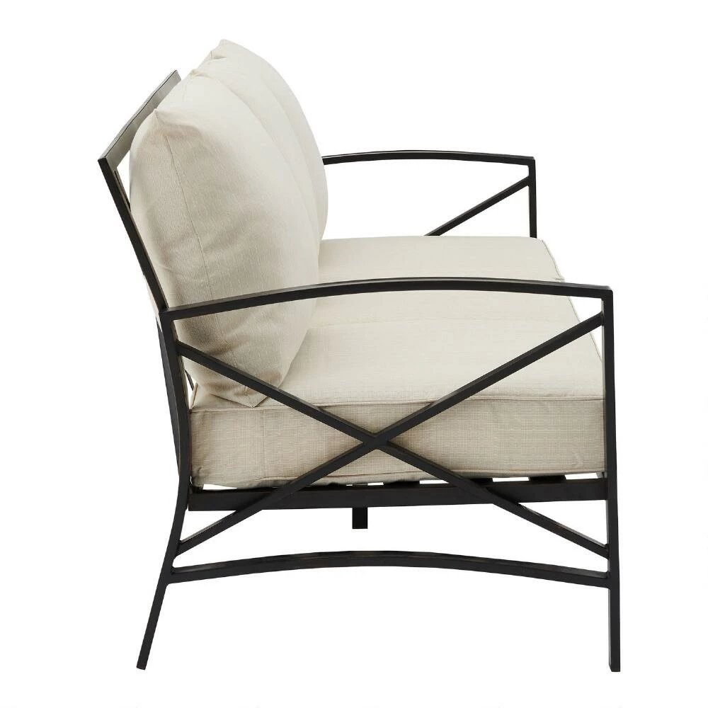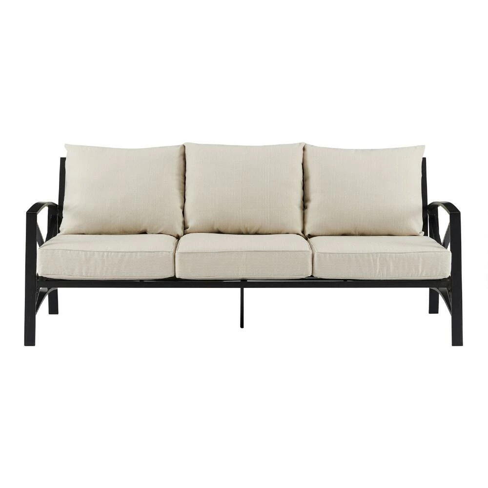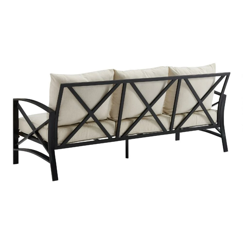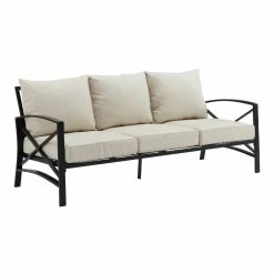 A sleek bronze frame with an X-back design and neutral oatmeal-toned cushions make our contemporary Araceli outdoor sofa an inviting place to unwind. Built with the elements in mind, this couch features sturdy steel construction, moisture-resistant cushion cores and polyester fabric upholstery made to protect against mildew and fading.