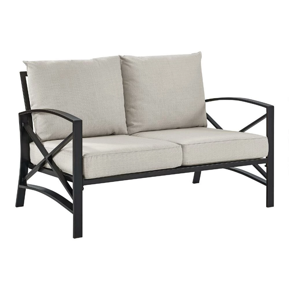 A sleek bronze X-frame and neutral oatmeal-toned cushions make our Araceli outdoor patio loveseat an inviting place to unwind. Built with the elements in mind, this contemporary sofa features sturdy steel construction, moisture-resistant cushion cores and polyester fabric upholstery made to protect against mildew and fading.