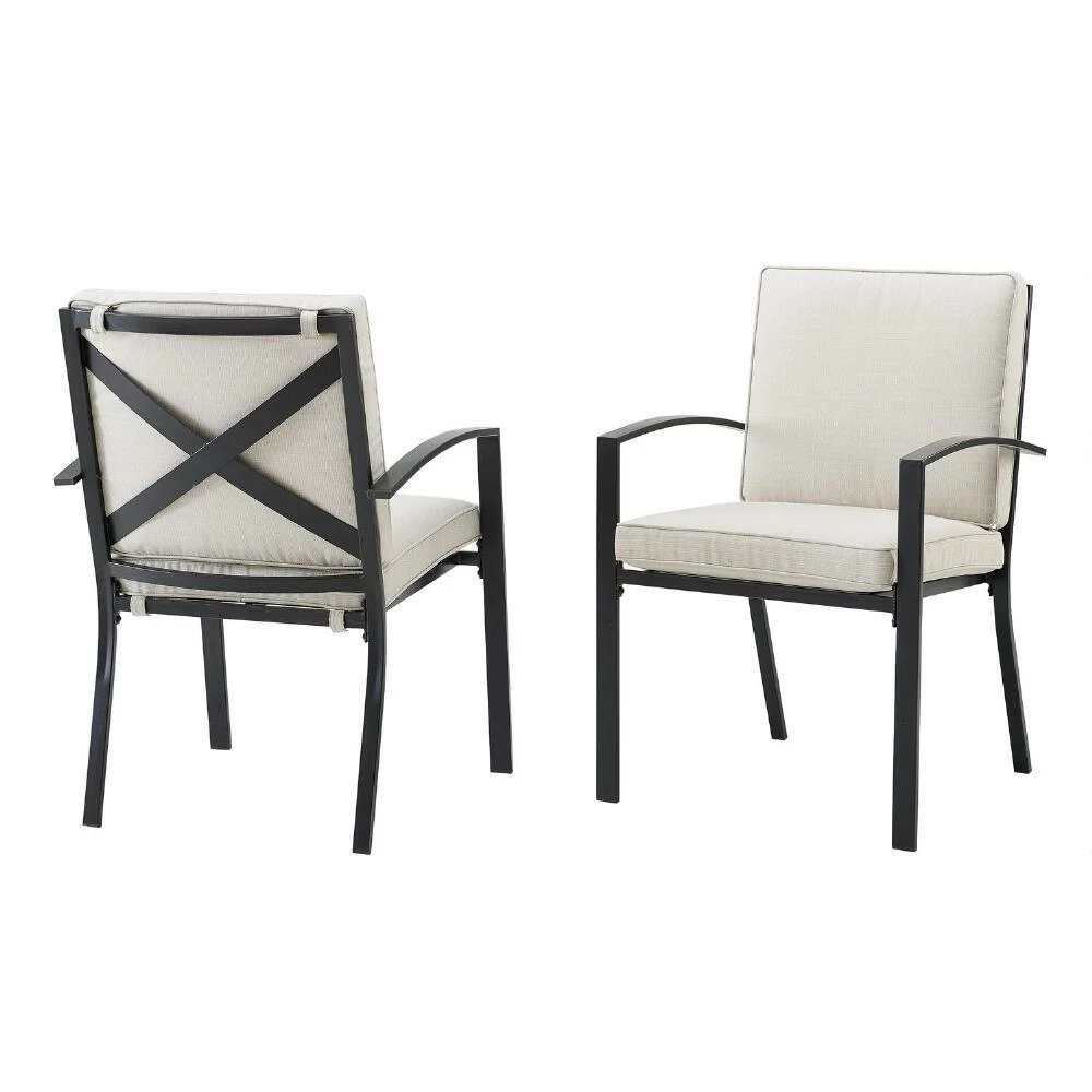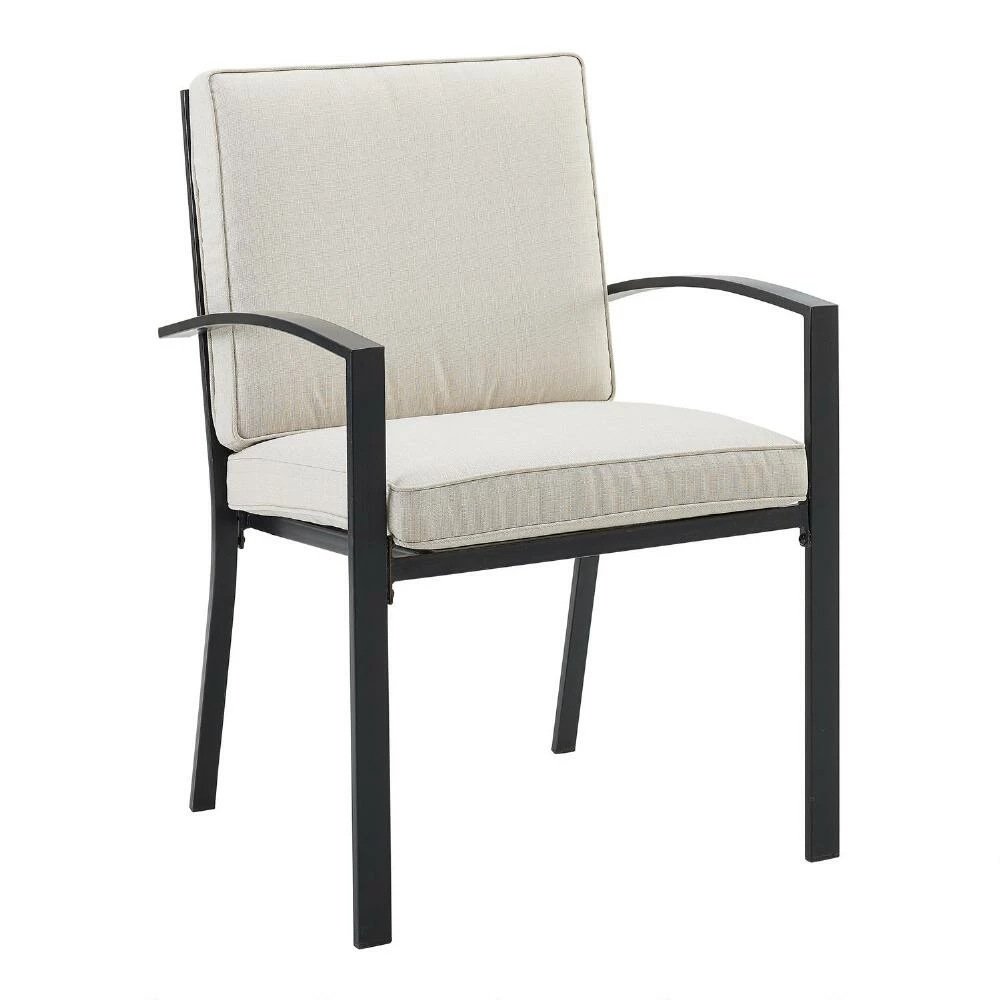 Featuring a weather-ready steel frame finished in oil-rubbed bronze, the Araceli patio dining chair invites you to the table with its plush neutral cushions. Durably crafted with a supportive seat, curved arms and classic X-crossed back, its sophisticated style complements both traditional and modern dining decor. Elevating the look of your outdoor decor, this set of two is a perfect match for our Araceli dining table.