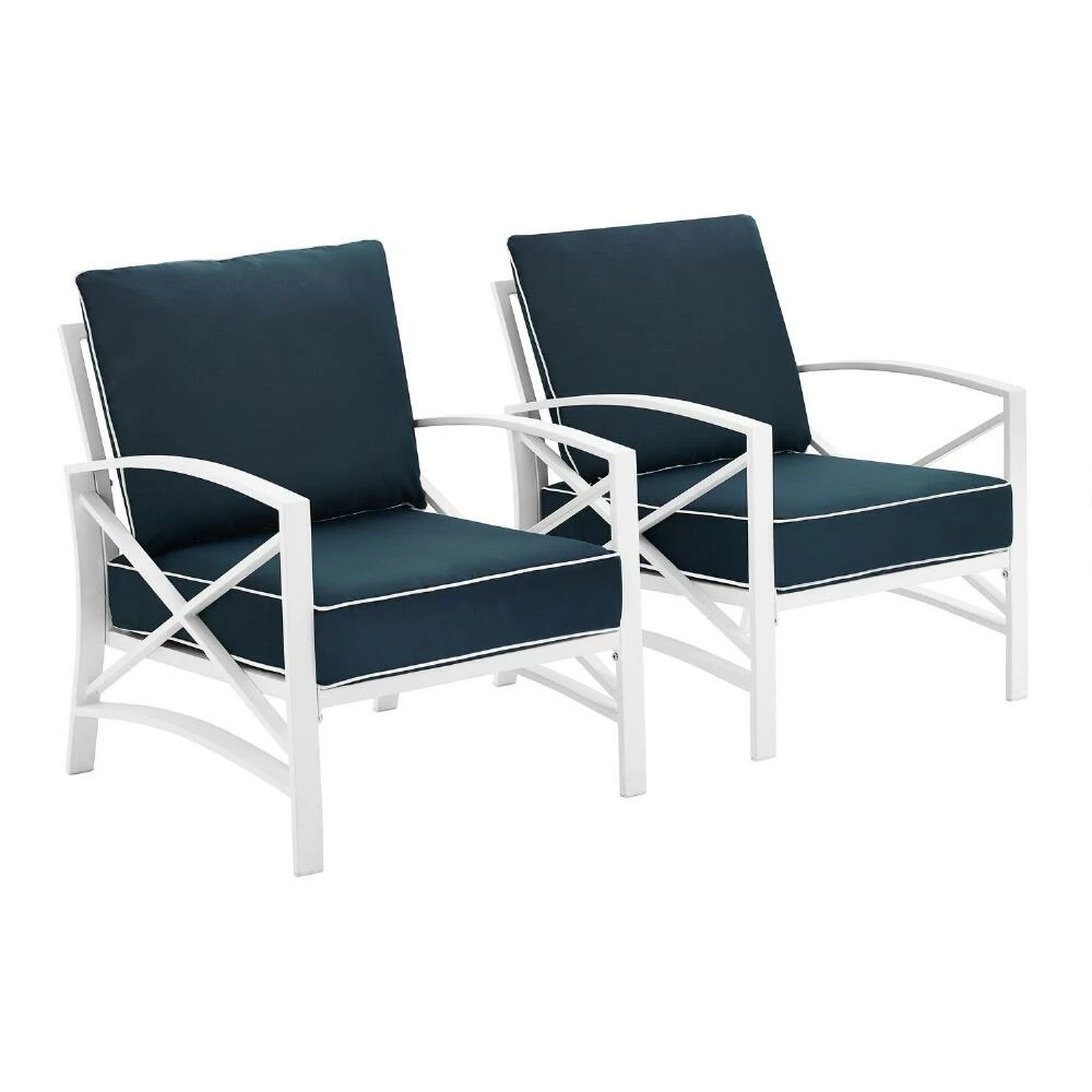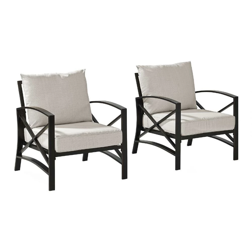 Featuring a weather-ready steel frame with a deep seat, the Araceli patio armchair invites you to kick back and relax into its plush cushions. Available with oil-rubbed bronze frames and oatmeal cushions or white frames with navy cushions, this sophisticated chair is a complement for both traditional and modern decor. A charming and comfortable set of two, these seats are perfect for couples who love to unwind on the porch or balcony.