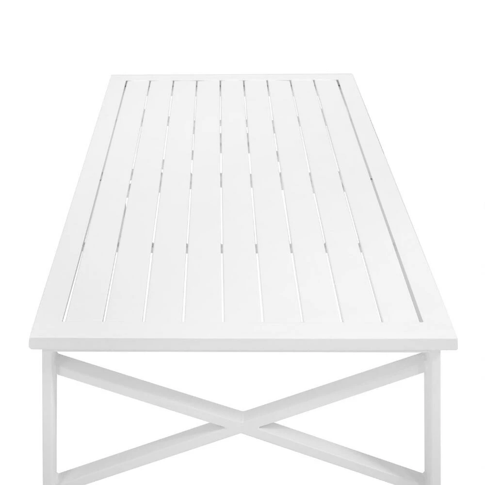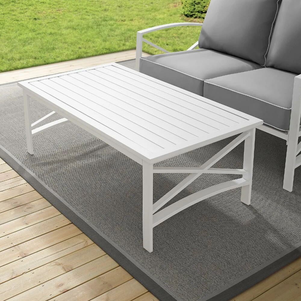 Designed to withstand wear from rust and weather, this versatile patio coffee table is constructed of steel with your choice of bright white or an oiled-bronze finish. With a slatted surface, decorative X-supports on the legs and a clean profile, this outdoor occasional table lends a contemporary edge to your alfresco lounging area.