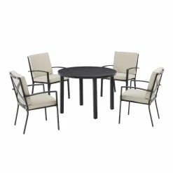 The Araceli outdoor dining set gathers four armchairs around the slatted-steel surface of a round dining table finished in oil-rubbed bronze. Readymade for cozy and intimate gatherings on smaller balconies, decks or patios, the dining chairs feature plush neutral cushions and the compact table includes an umbrella hole for entertaining in the shade. Simple yet stunning, this alfresco dining set makes the most of your outdoor space.