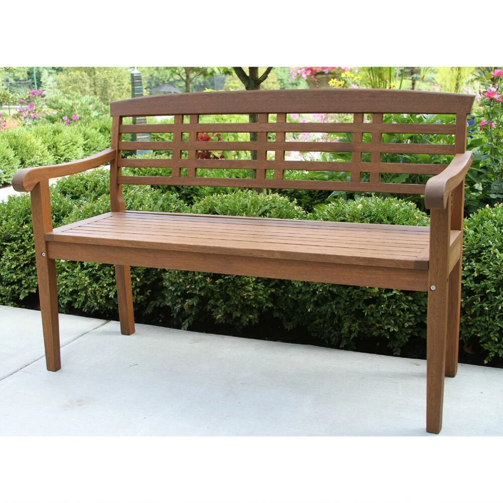 Invite friends and family to relax on your patio, deck or in your backyard space with the timeless Blake outdoor bench. Crafted of sturdy plantation-grown eucalyptus, this lounge-worthy wood bench is deigned to last year after year. The lattice design accents any walkway or garden with an impressive artisan touch.