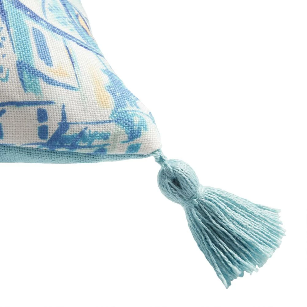 Featuring our exclusive print of Italy’s Amalfi resort in beachy-blue tones on an ivory ground, this lumbar pillow imbues your space with a chic summertime vibe. Made with an innovative process that puts recycled water bottles to good use – and suitable for indoor and outdoor use – it’s finished with a solid ivory back and fluffy blue tassels at each corner.