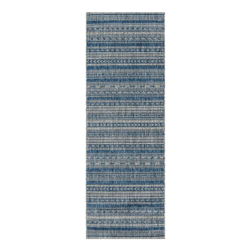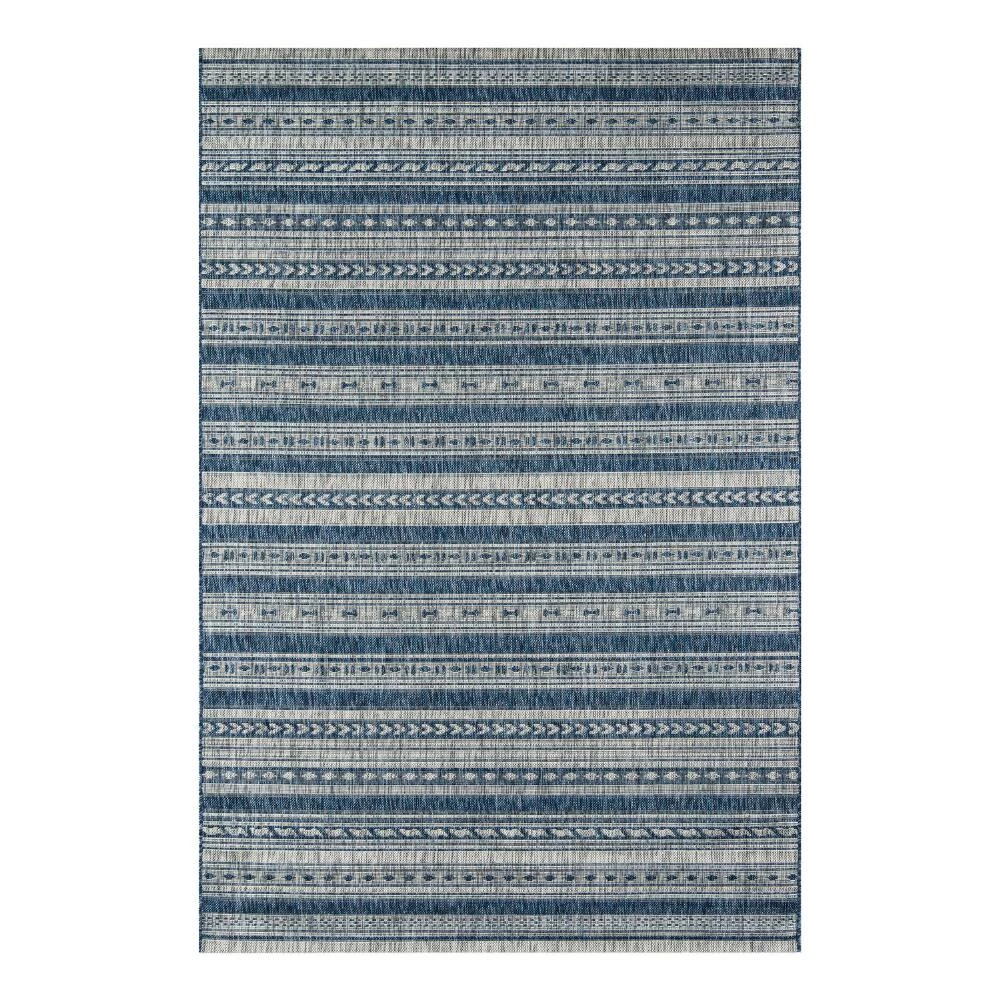 Featuring a chic blend of geometric white stripes on a blue background, our flat-woven indoor-outdoor rug is a fun and refreshing mix of traditional patterns. Easy to clean, safe for pets and surprisingly soft underfoot, it’s a versatile piece that adds an eye-catching look to decks, patios, courtyards and other high-traffic areas.