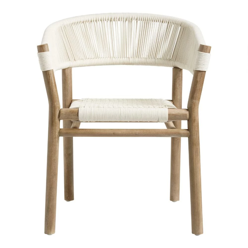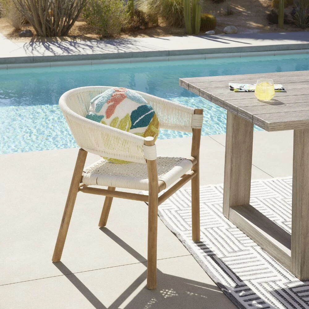 Our exclusive Cabrillo patio dining chair is crafted with ocean-ready nautical sailing rope handwoven over a sheltering, curved acacia frame in a natural hue. The refined texture of the antique-white rope helps this versatile outdoor dining armchair bring modern, beach-worthy vibes to bistro sets, balconies and decks.