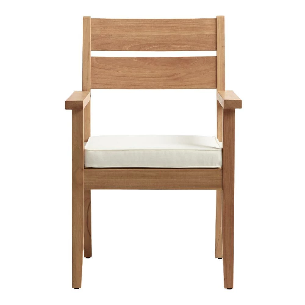 Our Calero dining armchair with a seat cushion brings natural character to any outdoor space. It’s made of durable plantation-grown teak wood with an oil finish to bring out the natural color and character of the wood grain. Complete with a plush antique-white cushion, this relaxing patio dining chair invites guests to linger over their meal.