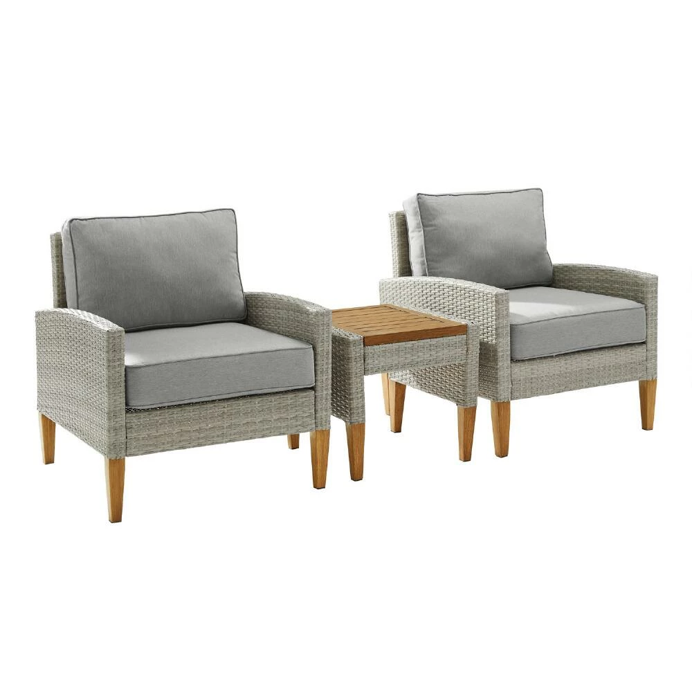 Handwoven with gray all-weather resin wicker, the Capella outdoor furniture set matches two armchairs with a side table that fits neatly between them. Exuding a modern coastal charm, the lounge chairs are incredibly comfortable with springy gray cushions and the accent table features a surface hand painted a teak-wood hue. With steel frames and faux-wood legs, this patio seating set is an exceptionally durable complement for any decor.