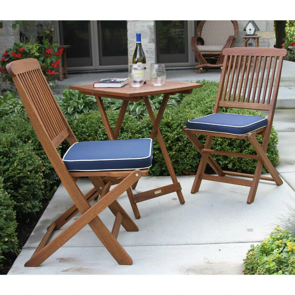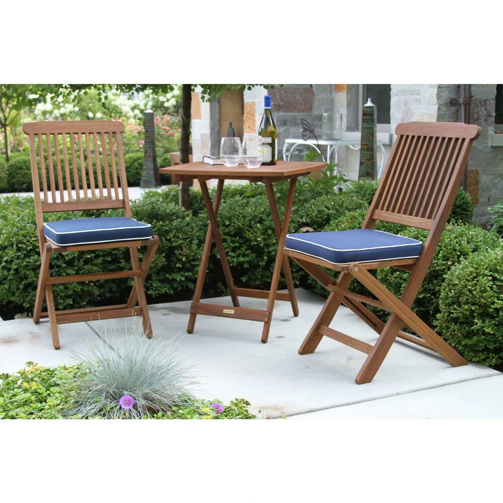 Outfit your patio or garden with our classic, fully assembled bistro set featuring a tapered square table and two chairs crafted of eucalyptus hardwood, plus two weather-resistant blue seat cushions with white piping. In an umber-brown stain finish, each piece folds for compact storage and easy portability.