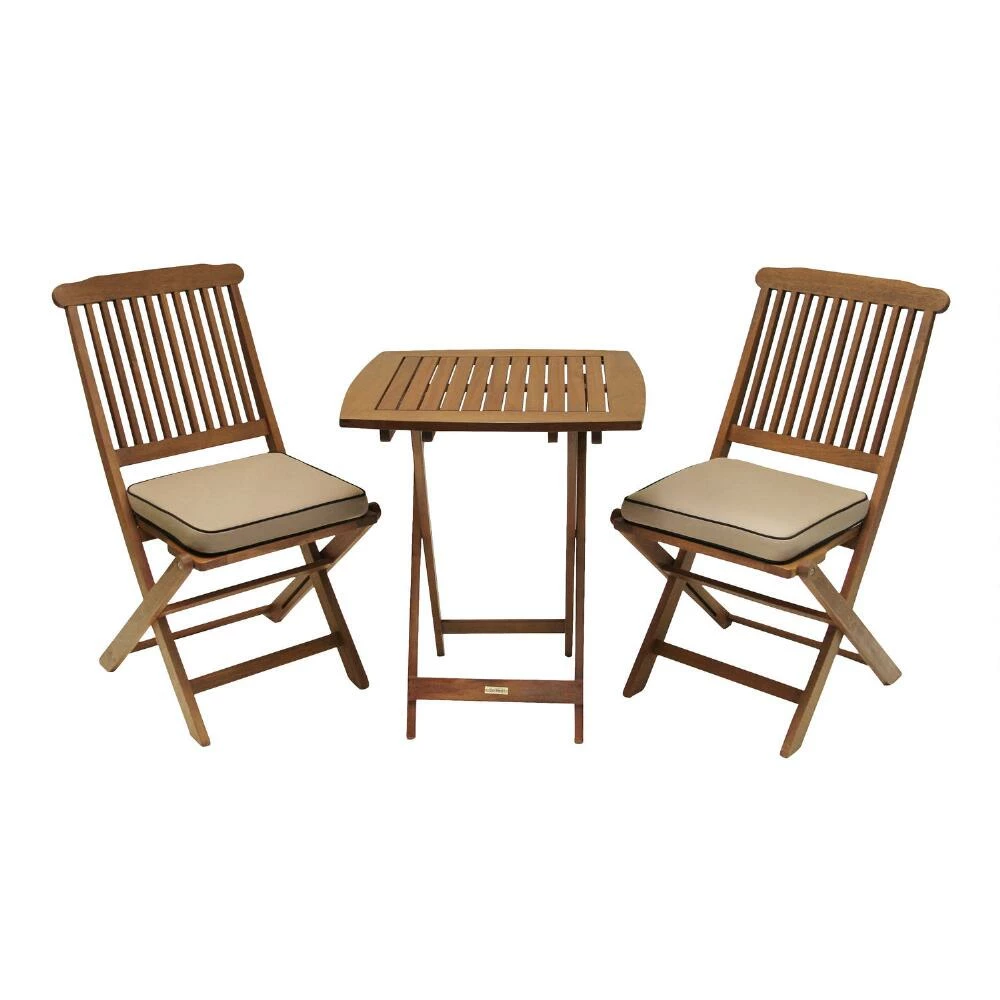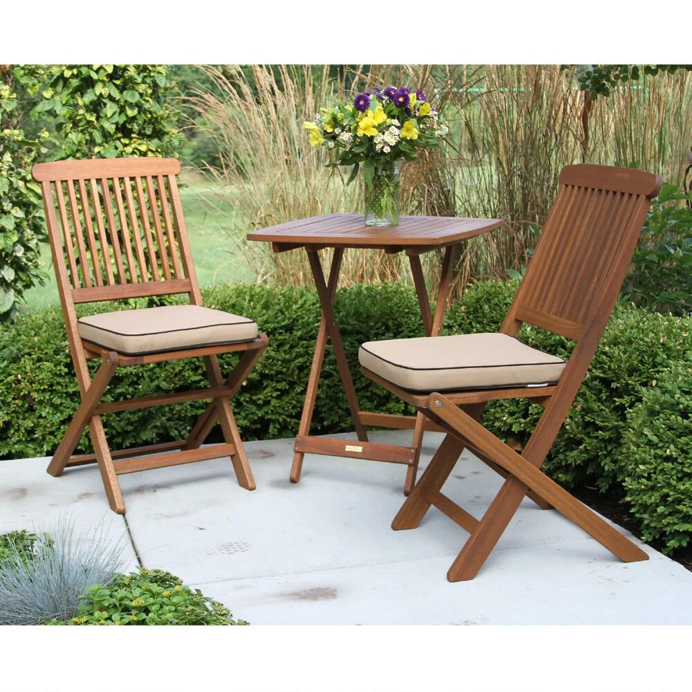 Our outdoor bistro set features a tapered square table, two easy-to-store folding chairs and two weather-resistant natural-toned chair pads with black piping. Crafted of solid eucalyptus hardwood with a rich umber brown finish, each piece comes fully assembled for instant alfresco dining.