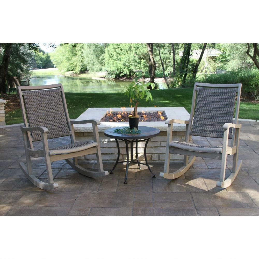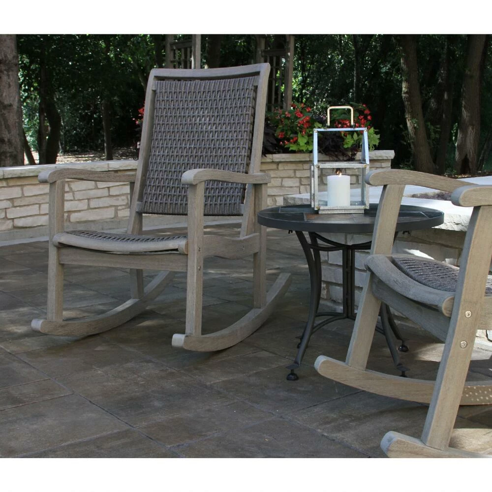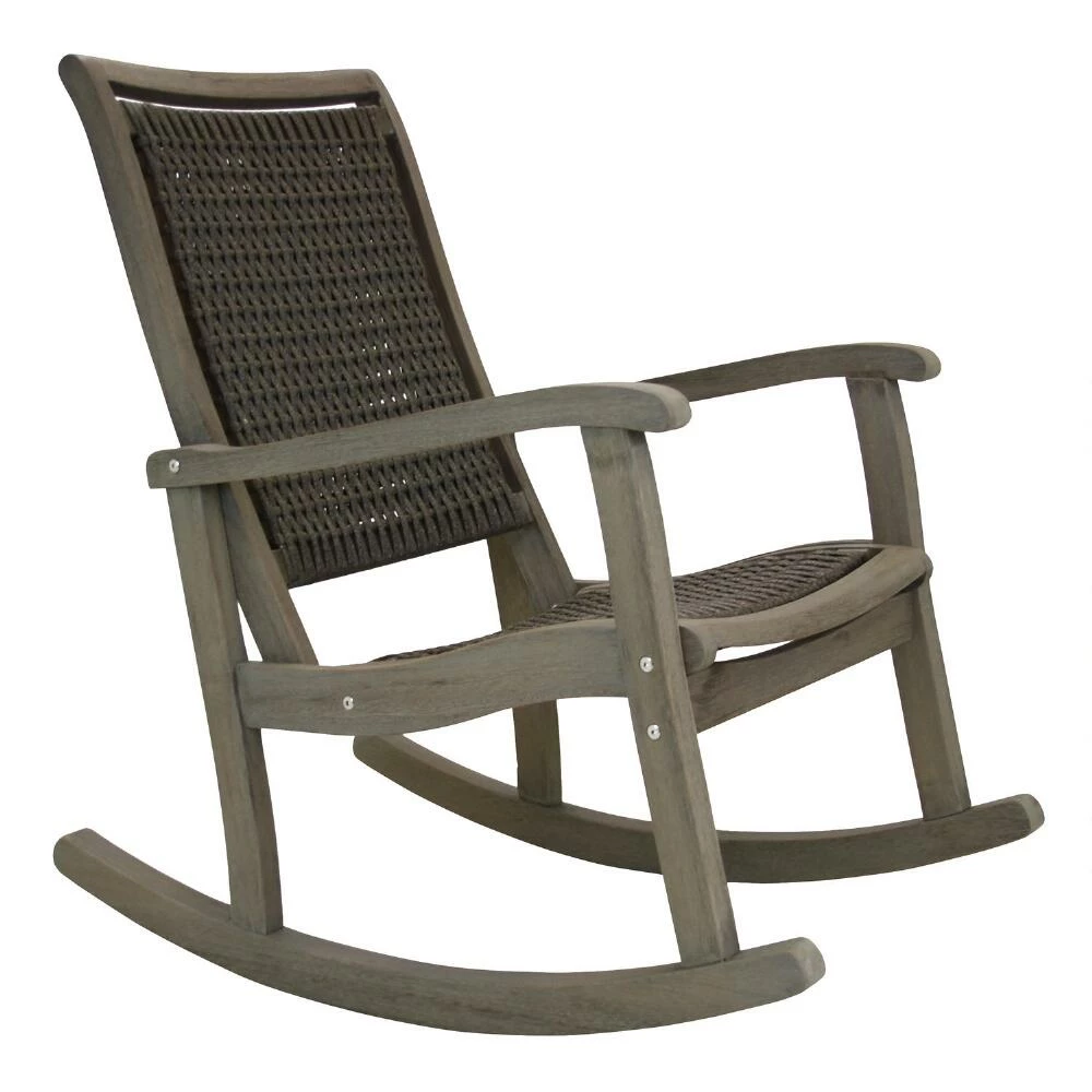A welcoming addition to any outdoor space, this relaxing rocking chair impresses with quality craftsmanship and a spacious deep seat. All-weather wicker is woven around a plantation-grown eucalyptus frame, which is textured by hand with a wire-brush for an artfully distressed look. This rocker is finished with three different coats of stain, making for minimal upkeep.