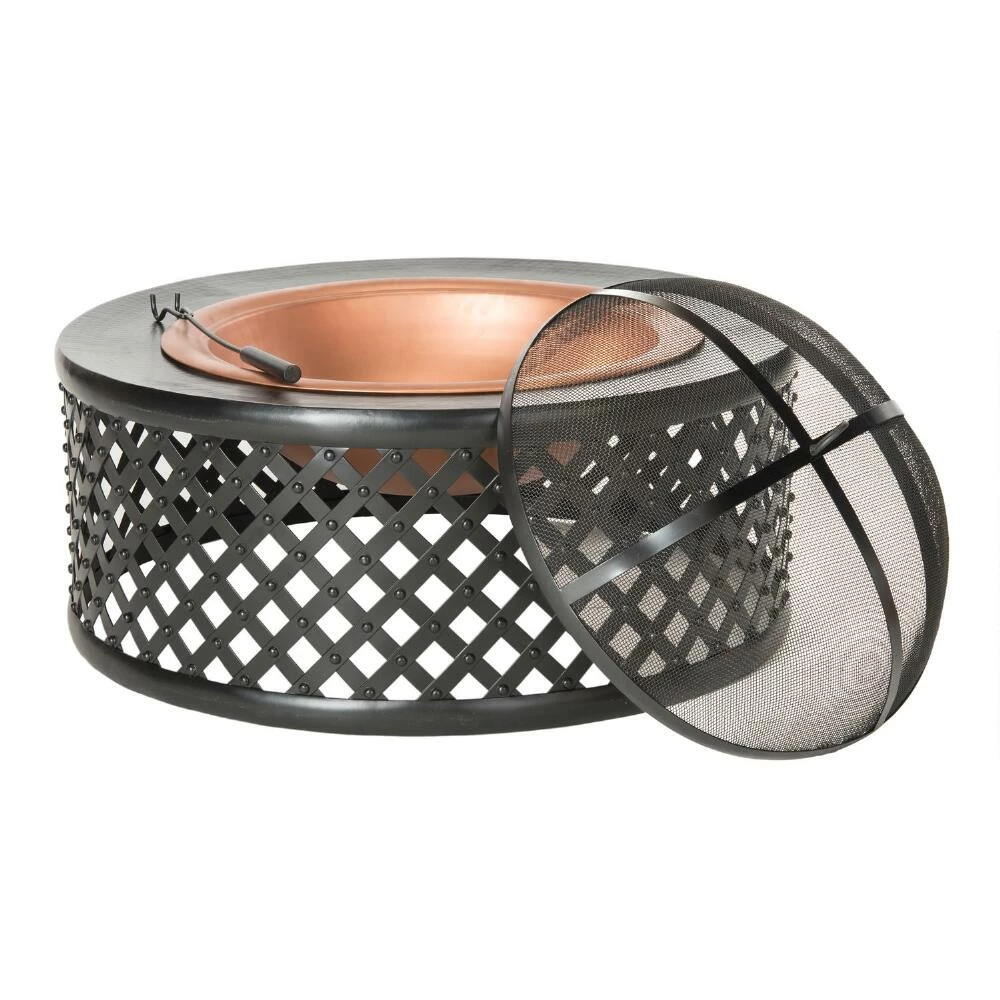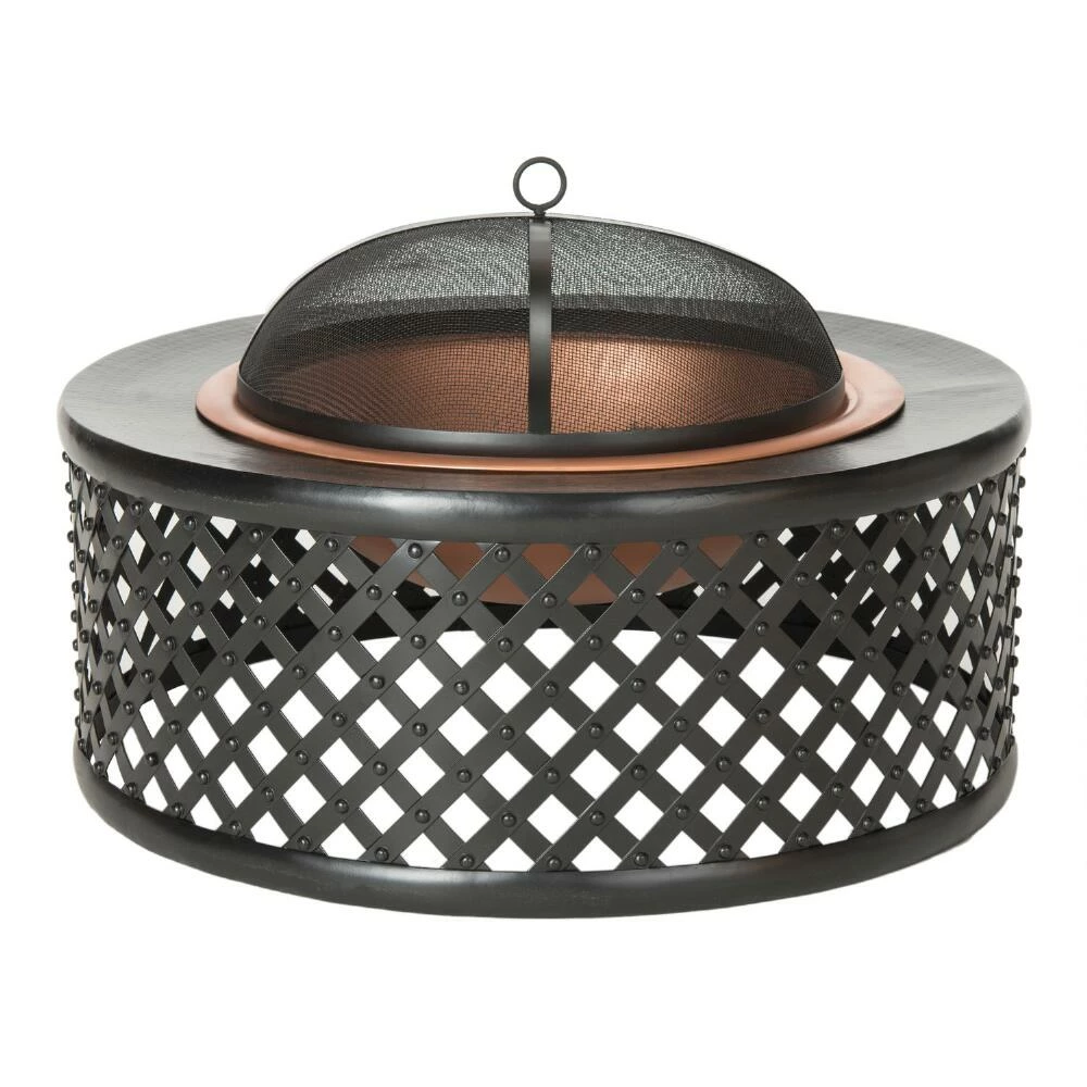 Featuring a base crafted of decorative black metal latticework and a copper colored bowl, our Lennox outdoor fire pit brings elegance and warmth to your patio. It comes complete with a domed mesh screen to allow a view of the fire while preventing flying sparks.
