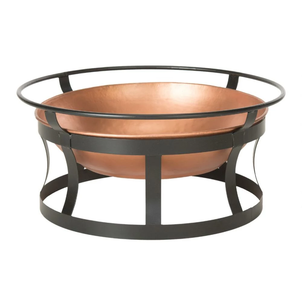 Light up the night with this round wood-burning fire pit featuring a solid copper tub cradled in an open geometric stand of durable black steel. Adding two-tone modern beauty to small outdoor spaces, its compact design is an ideal centerpiece for intimate entertaining with friends and family. Stoke the flames with the included poker as you gather on the patio or deck to roast marshmallows and share warmth in the twilight.