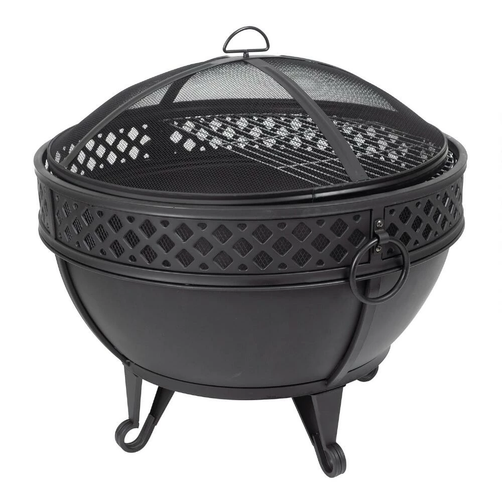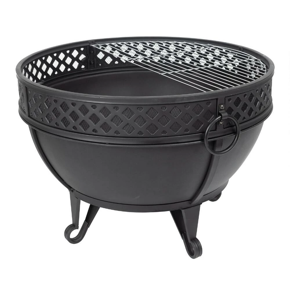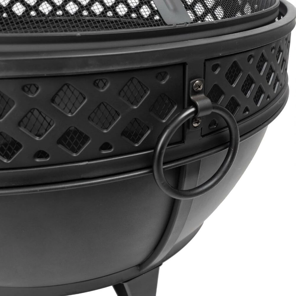Create a cozy place for gathering in your outdoor space with the black Corbin fire pit designed with a decorative geo pattern. Its deep bowl creates a longer lasting, more consistent fire by raising the wood off the bottom and allowing oxygen to circulate around it. This complete fire pit set includes a full-coverage mesh screen, fire poker, ring handles for safe transport, drainage holes, and even a cooking grid for grilling your favorite foods.