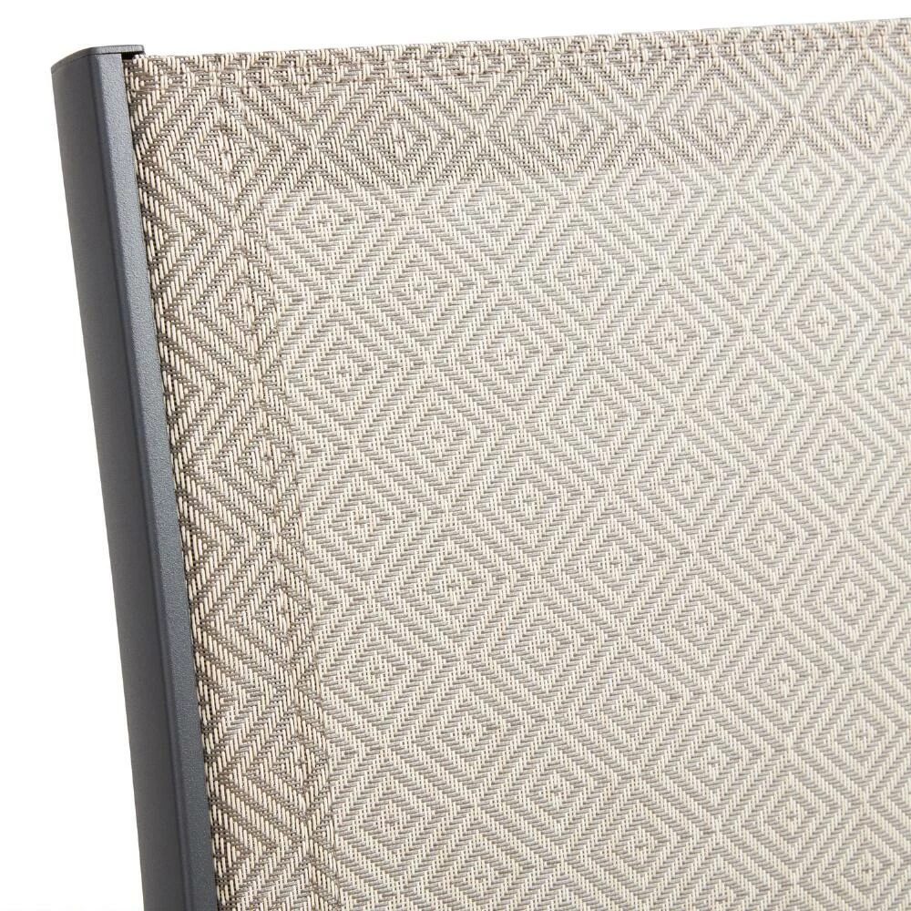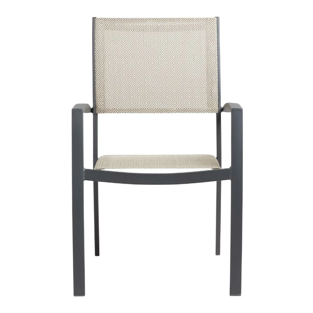 Our Cordoba stackable outdoor dining chairs set a beautiful stage for alfresco gatherings. Crafted with a charcoal-gray aluminum frame and tonal mesh fabric with an abstract diamond pattern on the seat and back, these stylish patio chairs are low maintenance, easy to move and stack and resistant to rust and chipping. Bring family and friends together with this set of modern, easy-care dining armchairs.
