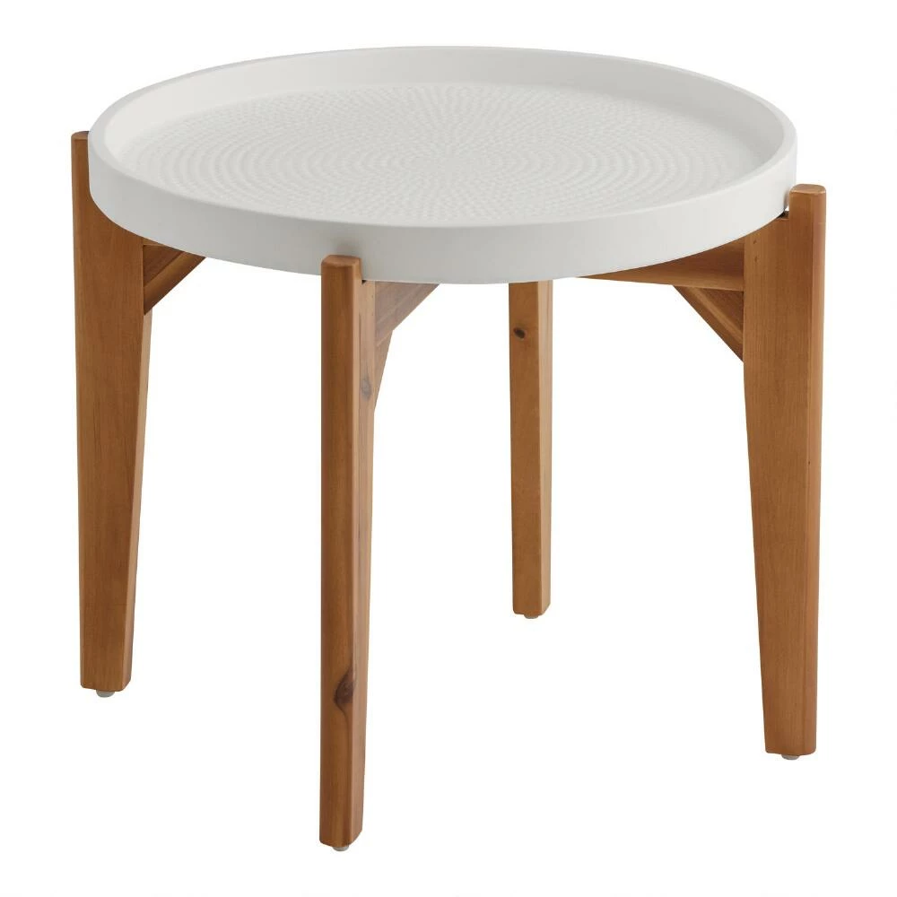 The round cement top of our exclusive Dorothy patio accent table is crafted with a series of irregular dots, creating outdoor decor with added visual interest. Mixing materials for a stunning modern piece, its bright white surface is set atop a base of sturdy acacia wood with a natural finish. Available in two coordinating sizes, this weather-resistant side table refreshes the look of any outdoor seating arrangement.