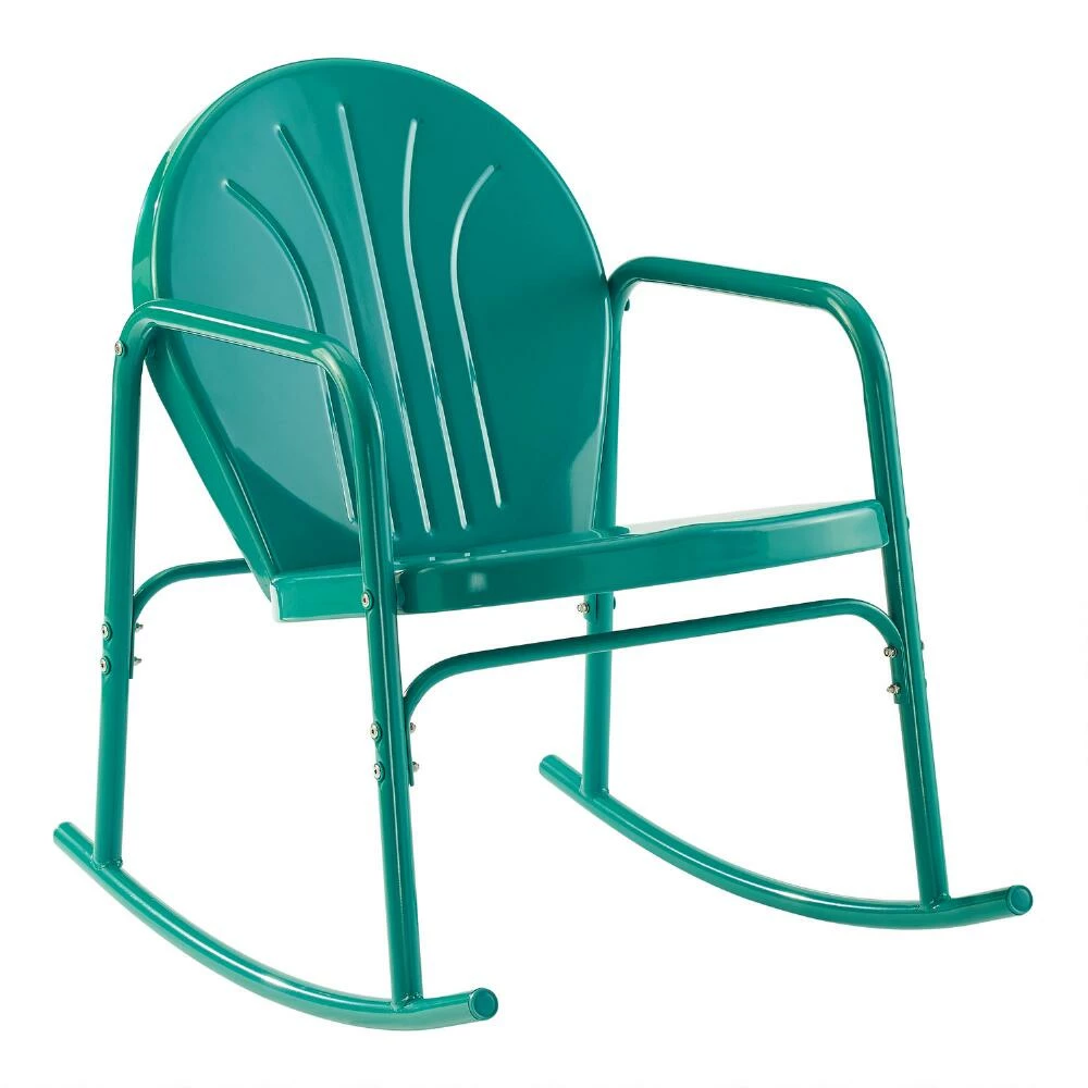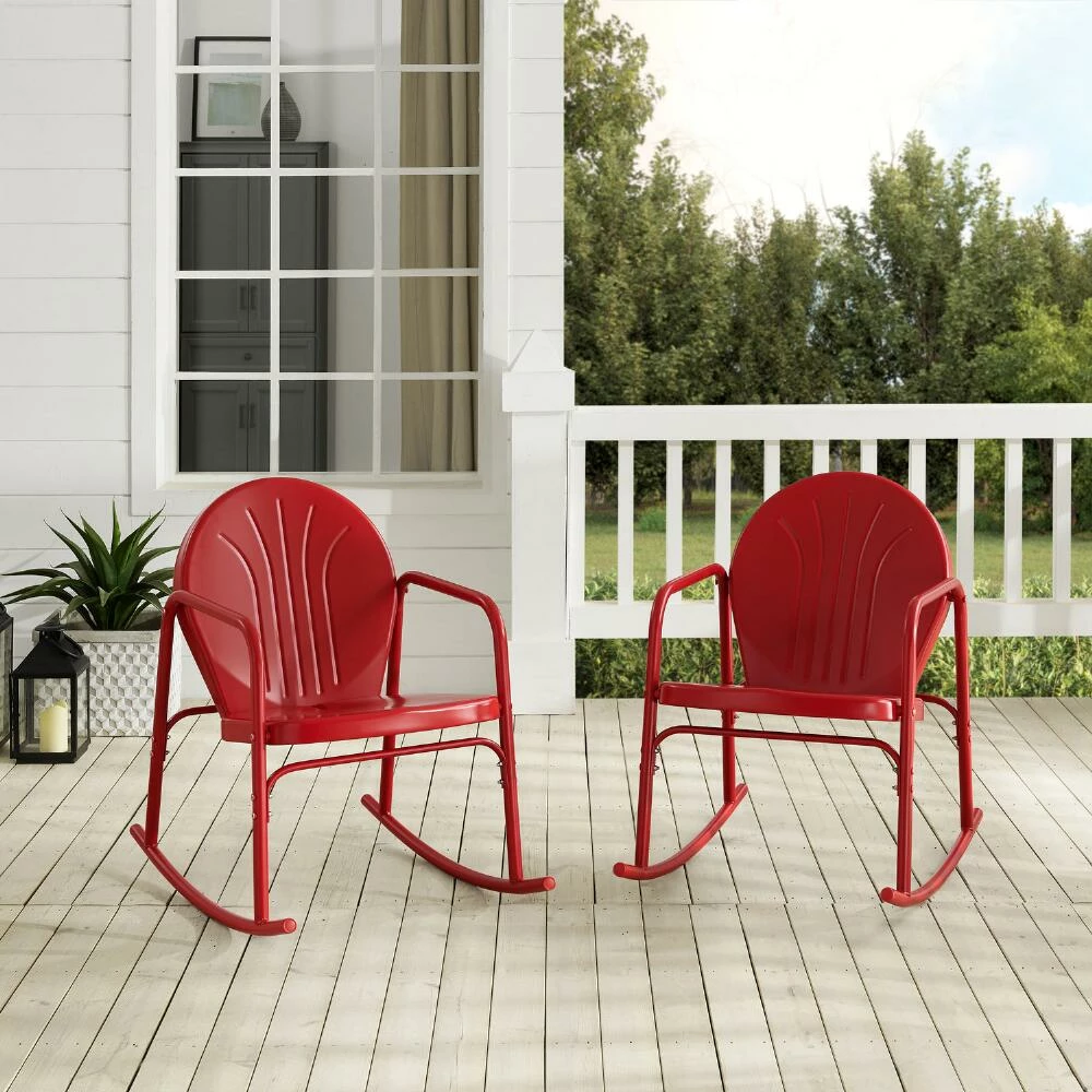 Sit back and enjoy your backyard space in style with this set of two outdoor rocking chairs, made of powder-coated steel and available in four colors. With curvy retro lines for a minimalist look that also focuses on comfort and function, these patio chairs feature a gently slanting seat, rounded arms and smooth rockers. Their sturdy construction and UV-resistant painted finish makes them a low-maintenance outdoor seating option.