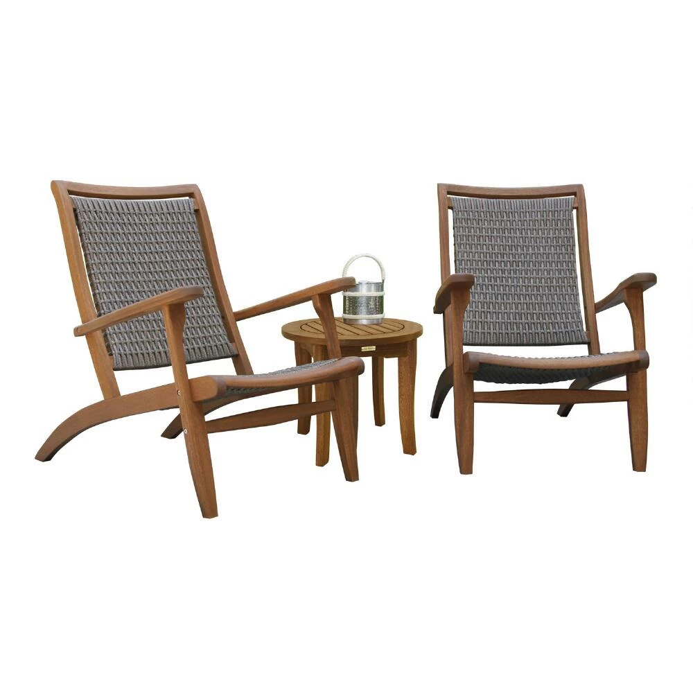 Our outdoor patio furniture set creates the perfect spot to unwind outdoors with two low-profile loungers and an accent table made to withstand the elements. Plantation-grown eucalyptus wood in a rich brown finish frames chunky, woven resin wicker in a driftwood-gray hue for contemporary contrast, and a solid eucalyptus table offers a perch for a cup of coffee or a glass of wine.