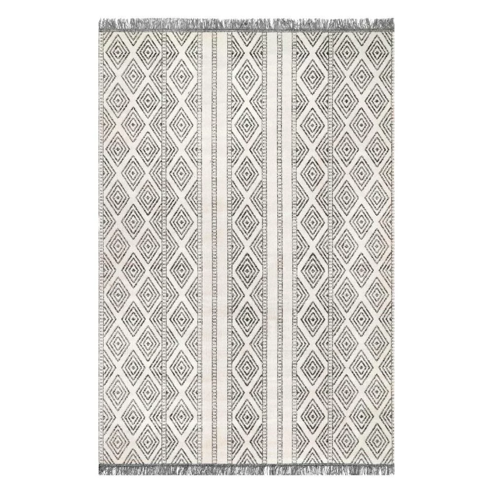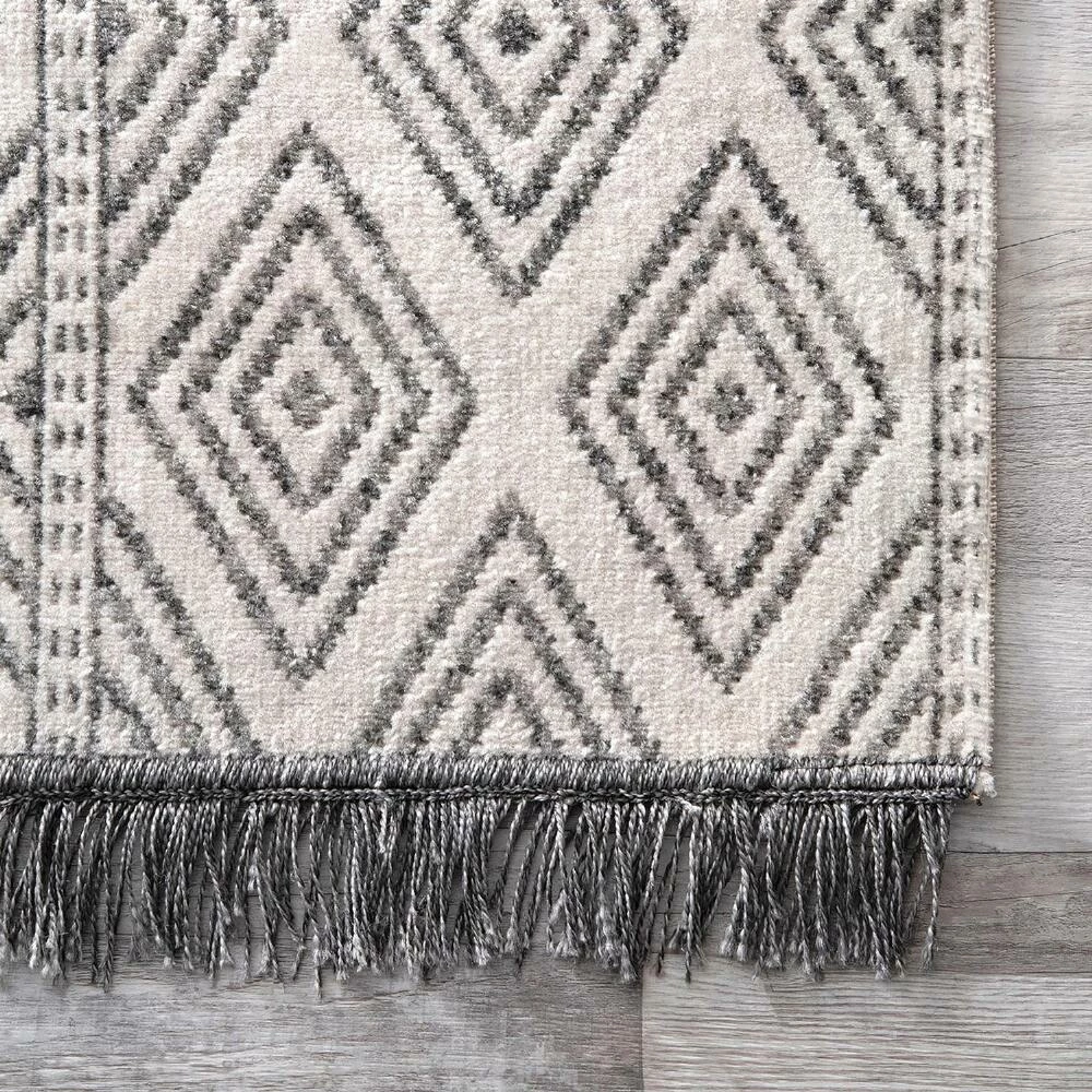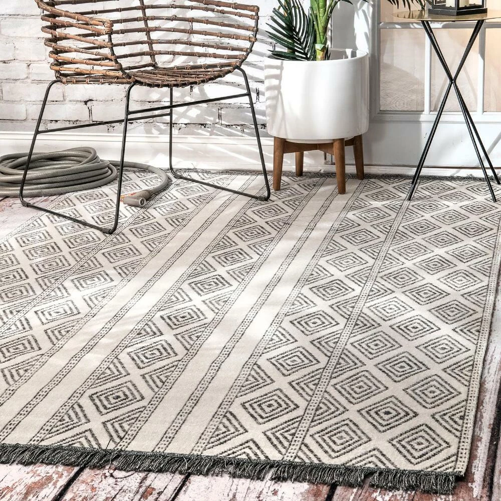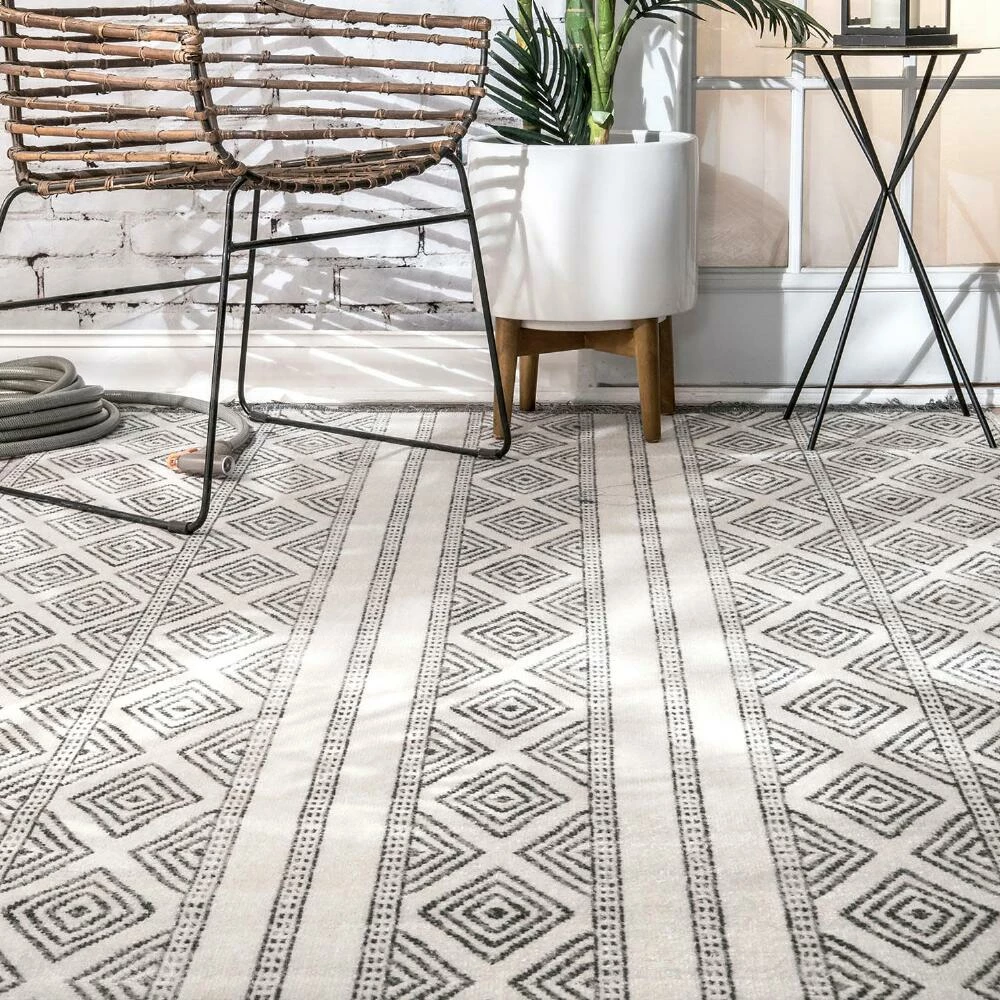 Create a fresh foundation in your space with the detailed diamond-lattice and stripe pattern on this indoor-outdoor area rug. Designed to withstand the rigors of high-traffic areas, it’s a resilient and pleasantly neutral option for any style of decor. Finished with a soothing gray and ivory palette and tassel trim, it’s available in a variety of standard, floor-runner and square sizes to fit any spot.