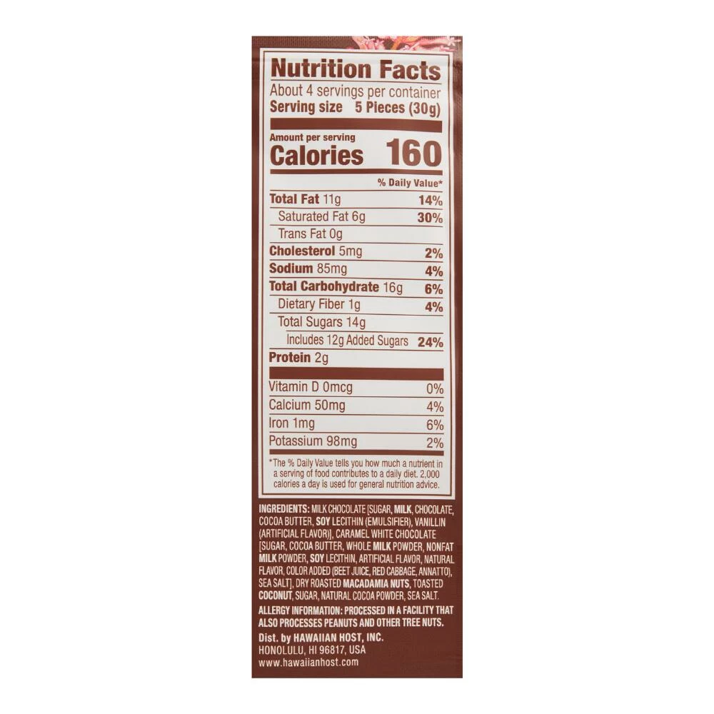Delectable macadamia nuts are enrobed in toasted coconut, toffee and rich milk chocolate with a finishing touch of cocoa powder to create this signature Hawaiian treat. From its humble beginnings in Honolulu over 80 years ago, Hawaiian Host specializes in creative combinations of premium chocolate and buttery macadamia nuts.