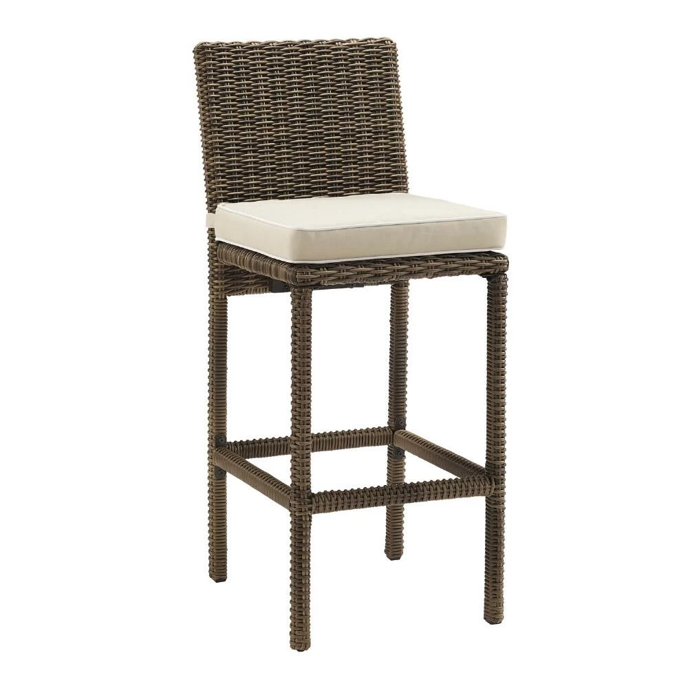 Establish an entertaining hub in your outdoor space with the timeless Jace barstools. Crafted of all-weather wicker in a rich brown finish, their classic design withstands the elements. Finished with comfortable moisture-resistant fabric cushions in a neutral sand hue, this patio bar chair set provides a casual, coordinated look that invites friends and family to kick back and relax.