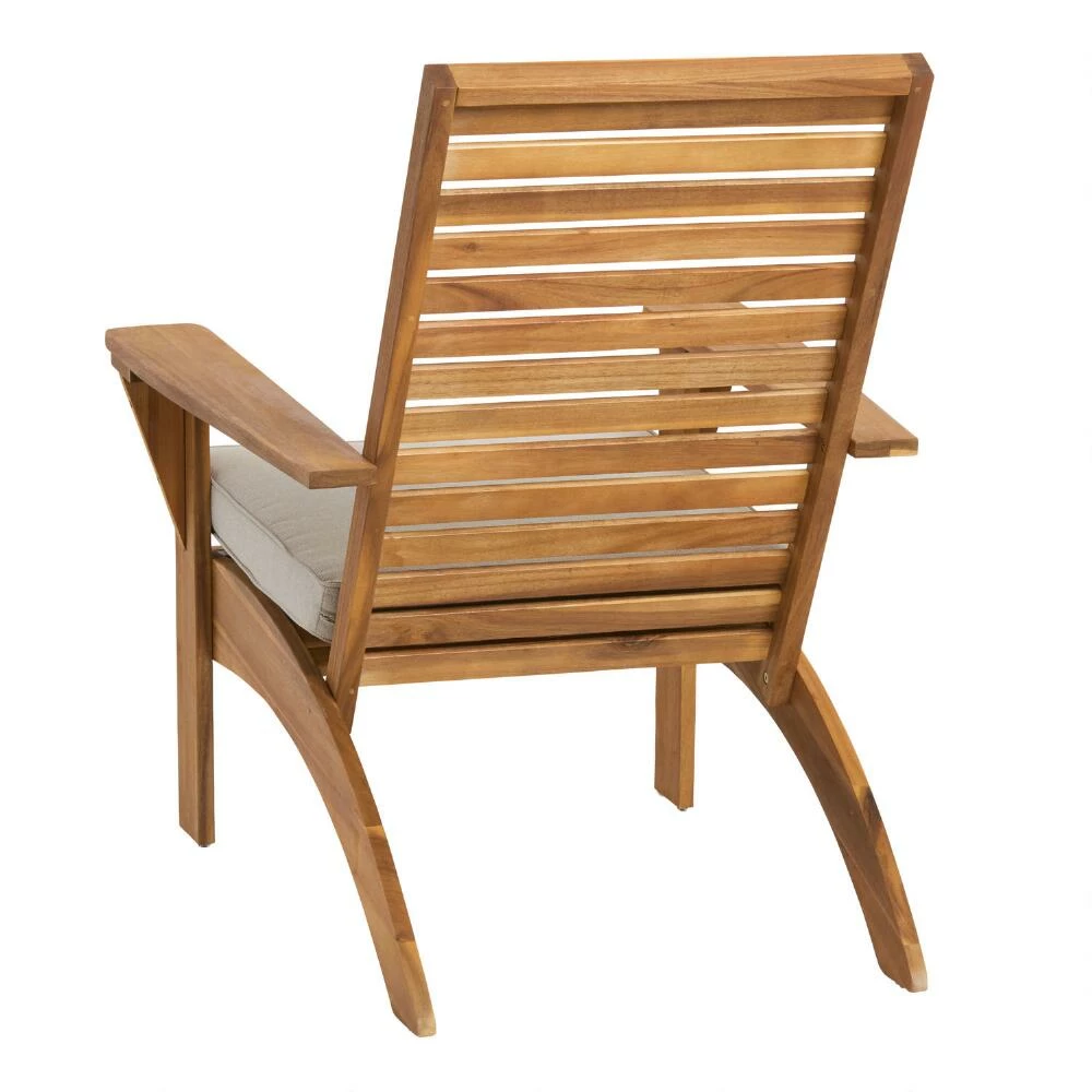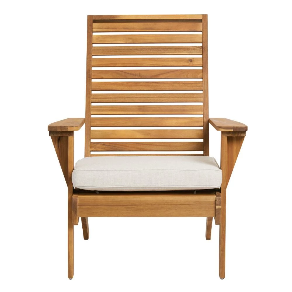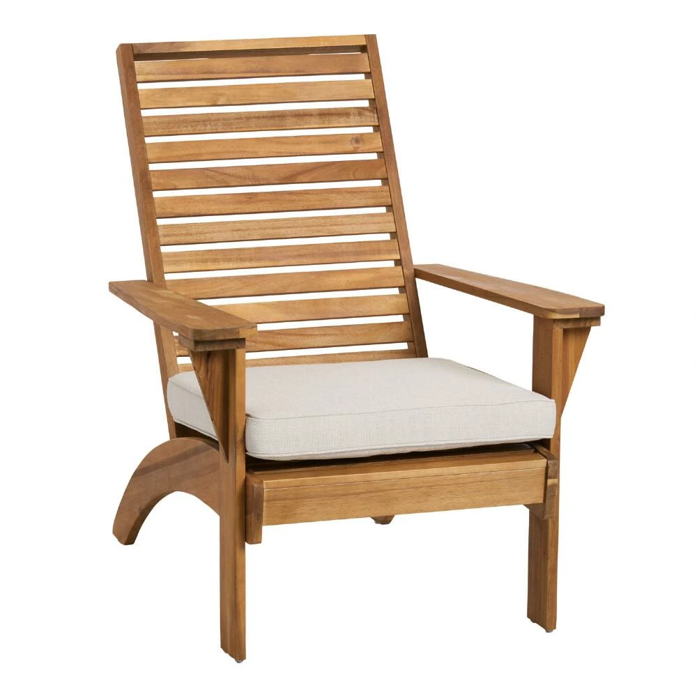 A swanky new take on a classic Adirondack chair, our Kapari outdoor chair is designed with a pitch that’s just right for lounging. Its slatted back and substantial footprint make a stunning statement, while its comfy cushion and wide arms enhance your relaxation. This outdoor patio armchair’s natural wood finish will suit any backyard or deck decor.