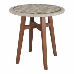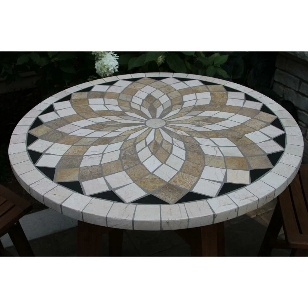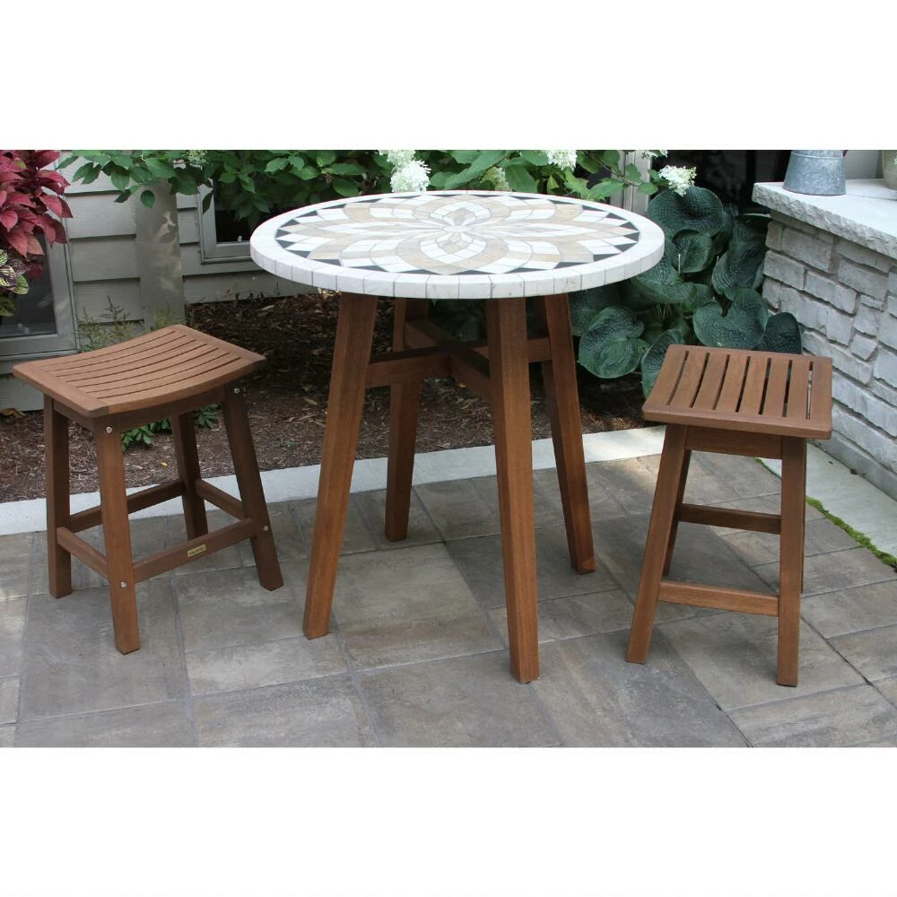 The Kimo outdoor counter-height dining table features a mosaic tabletop handcrafted with pieces of real Spanish marble. Designed to weather the outdoors, this classic patio dining table is made with water and UV-resistant resin grout and stands on solid eucalyptus wood legs finished in a brown-umber stain.