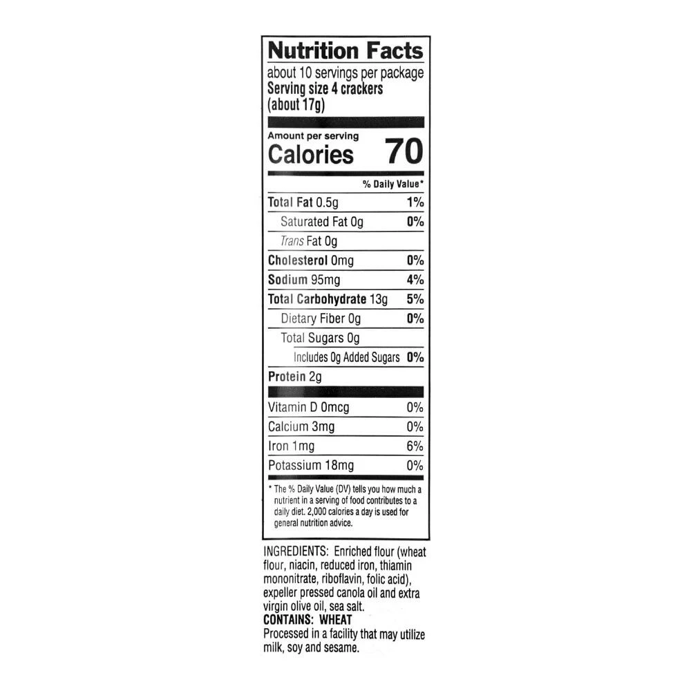 - Made with enriched flour, olive oil and sea salt
