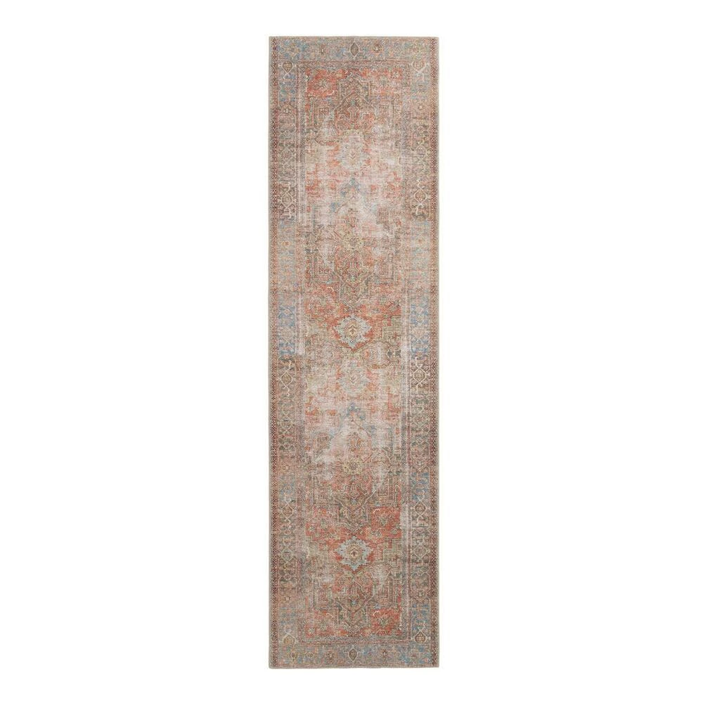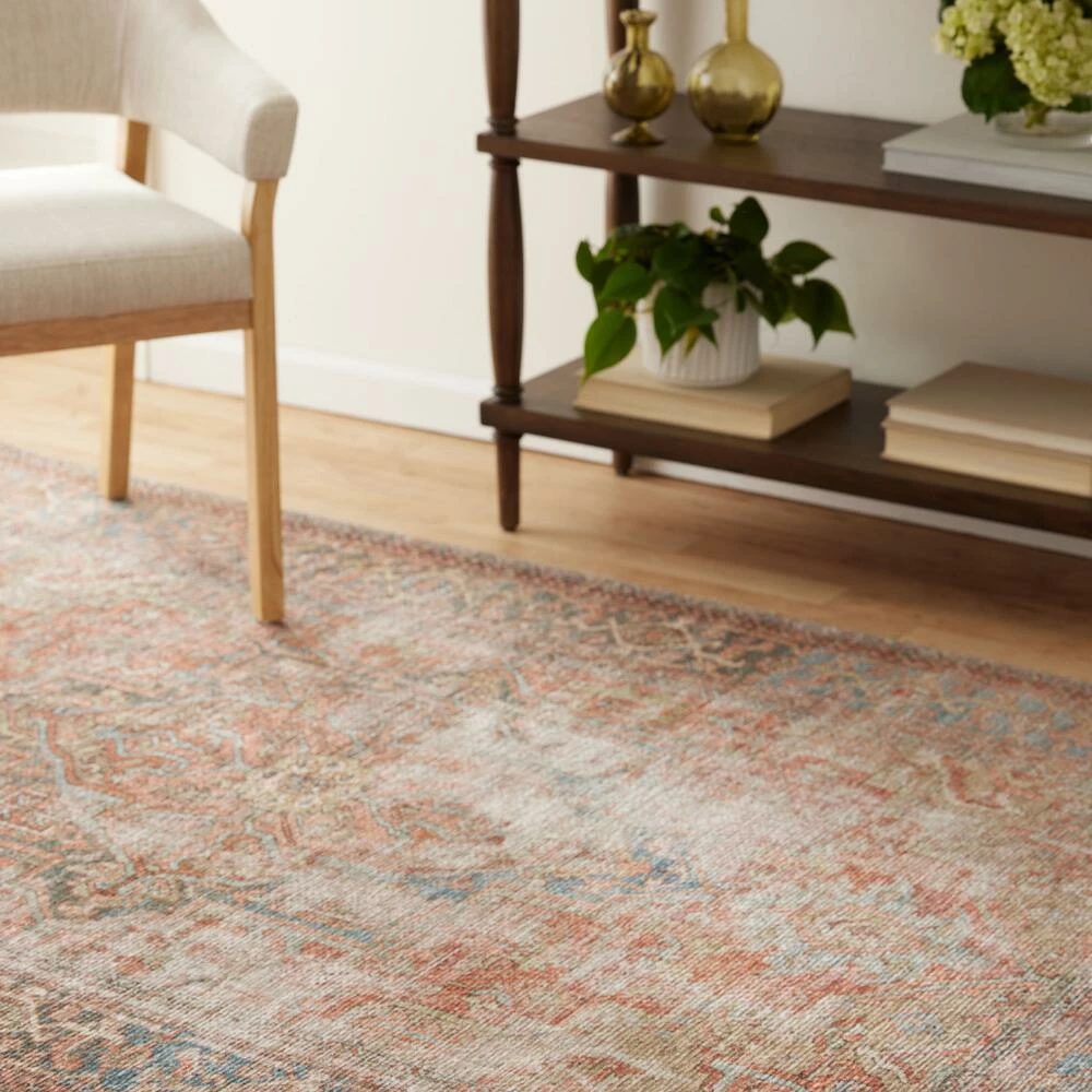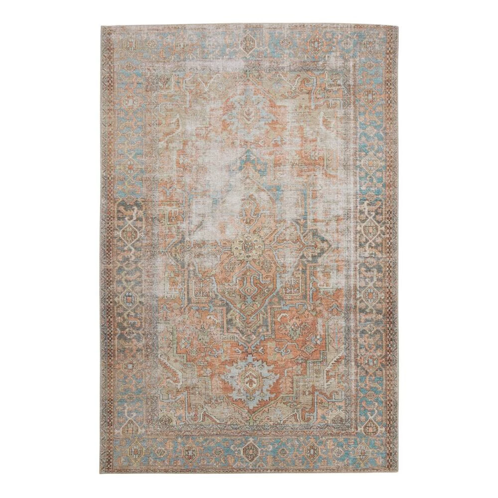 Our bestselling terracotta and blue Persian-style Lauren area rug is now suitable for use anywhere you please. Updated with an even softer and more durable material, its sumptuous polyester-chenille craftsmanship displays each individual knot in its textured weave. This timeless place-anywhere foundation is easy to keep clean, will not shed and is certified free of harmful chemicals.