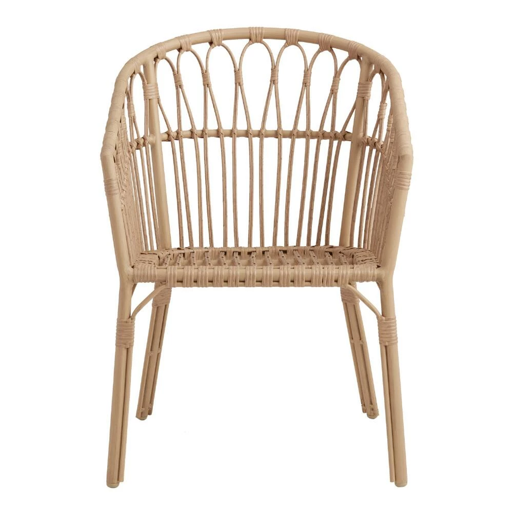 With an artful open weave in a light bamboo finish, our all-weather wicker Lenco outdoor dining chair has us dreaming of our very own glamorous lanai. The slender footprint of this small-space charmer makes it the darling of patios, balconies and anywhere your alfresco fantasies might be bigger than your actual space. Lenco features a rust-resistant aluminum frame with a cozy curved back to customize with our selection of indoor-outdoor pillows.