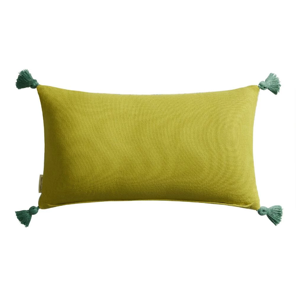In shades of aqua, teal and lime, the exclusive geometric print on the front of our lumbar pillow is inspired by Indonesian ikat and batik fabrics. The island-botanicals color palette gives off lush, tropical vibes that provides a vibrant update for your space with chic global appeal. Made with an innovative process that puts recycled water bottles to good use, it features a solid ivory back, while silky corner tassels give it an elevated look.
