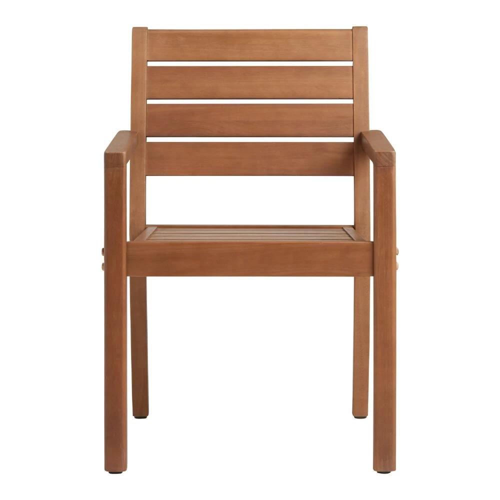Made of natural acacia wood with a comfortable slatted seat, our clean-lined Mariposa dining chair features straight arms, square legs and a classic ladder back. Place one of these streamlined seats at either end of your dining table to set yourself up for sophisticated patio entertaining. Made to last with a weather-resistant durability, you can pair this armchair with any of our square cushions to give it a cozy pop of colorful personality.