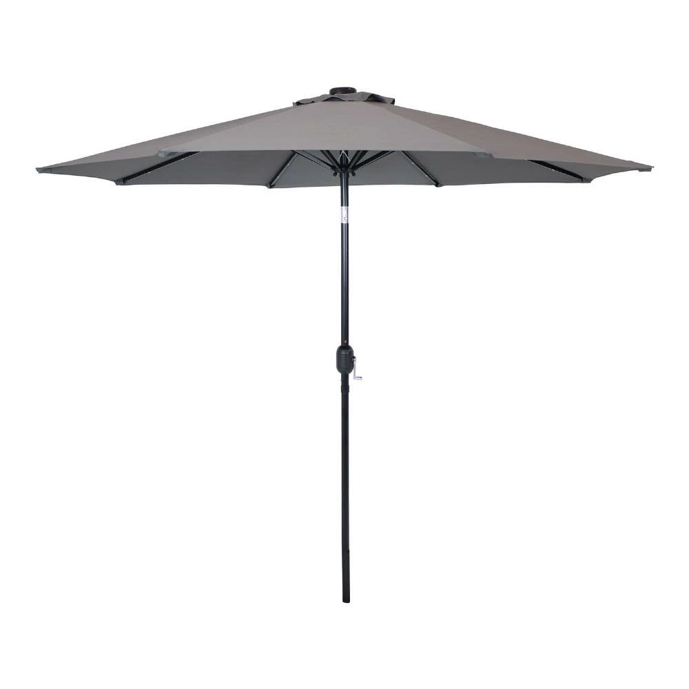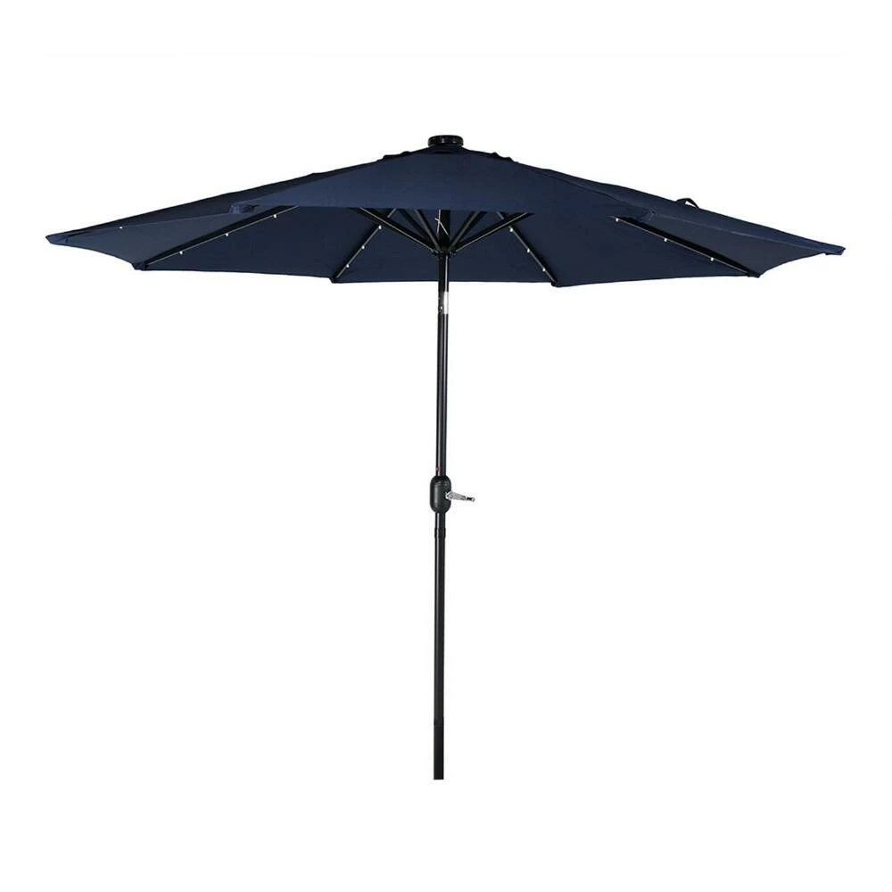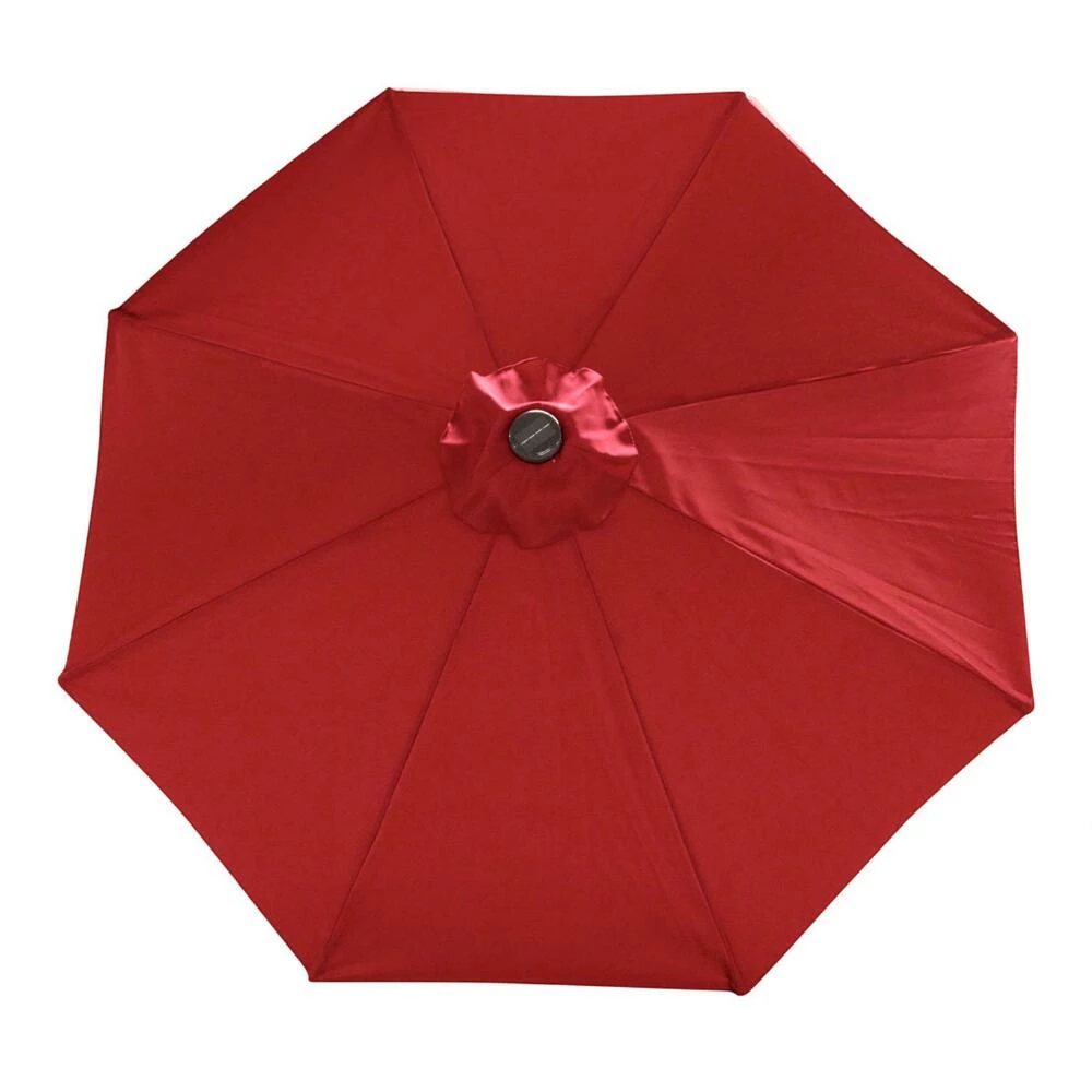 This 9-foot umbrella canopy and frame set shelters your patio from the sun during the day and illuminates it in the evening with 24 solar-powered LED lights. Set on a sturdy aluminum pole, this adjustable patio umbrella can be set to three tilt positions for all-day shade. Made of easy-to-clean, weather-resistant polyester, the durable canopy is vented for extra stability when open.