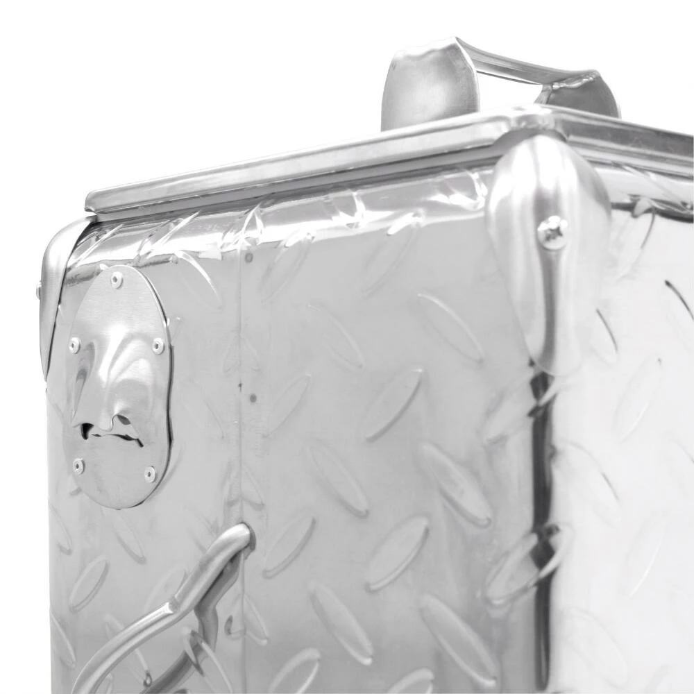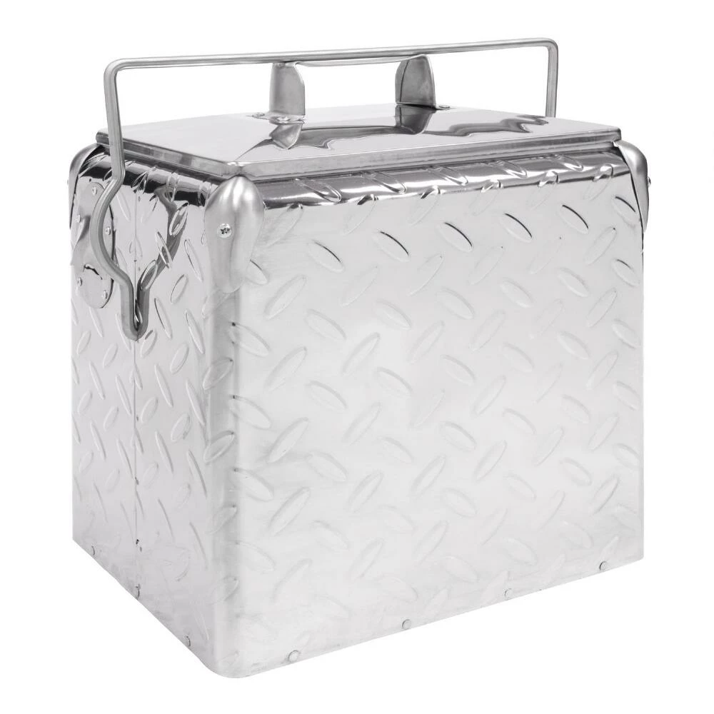 Crafted of steel with a shining metallic finish and gleaming chrome details, our retro beverage cooler keeps 18 cans or 12 bottles cold and ready to drink. Perfect for parties, barbecues, picnics and tailgating, this transportable cooler features a locking lid, a sturdy handle and a convenient built-in bottle opener.