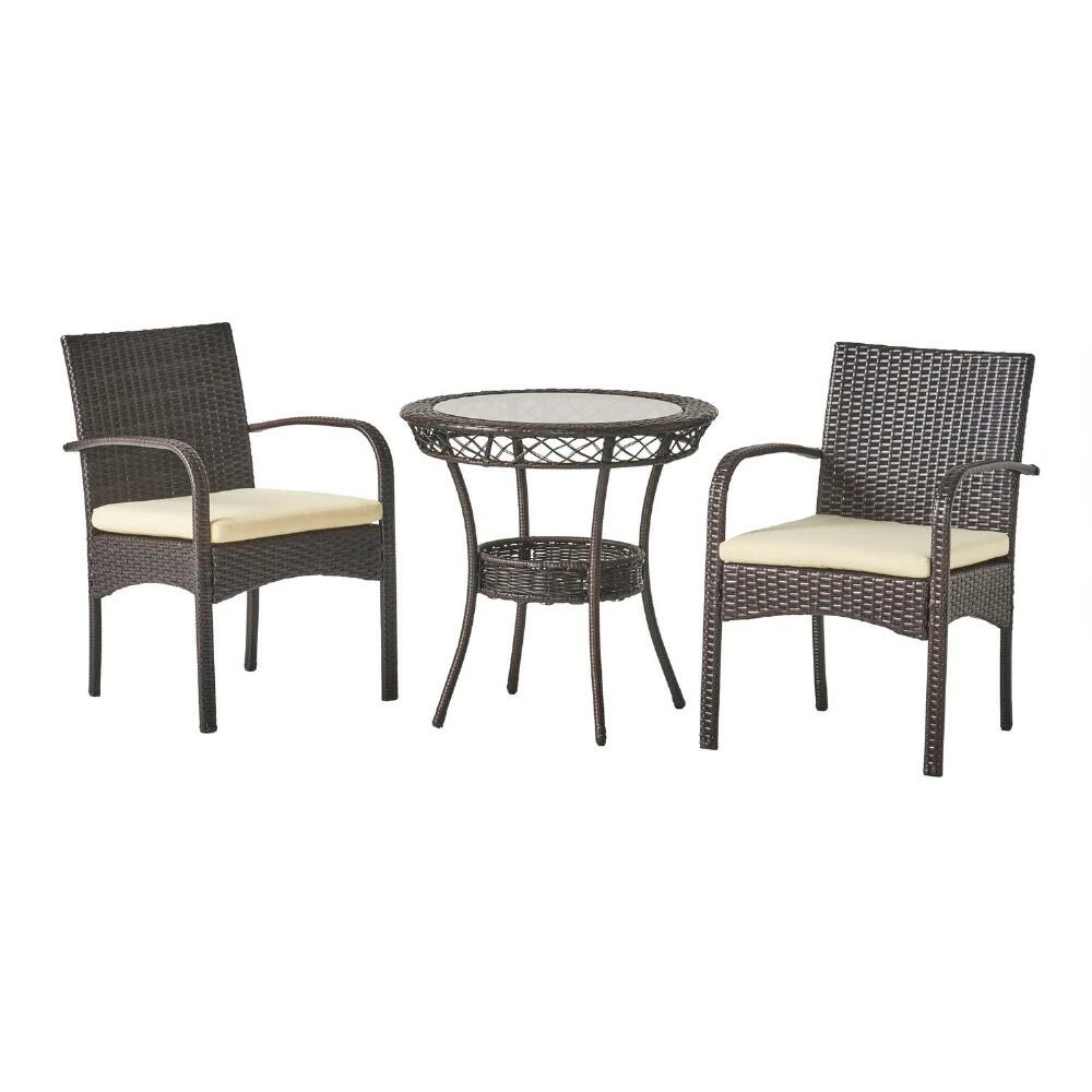 Woven of brown all-weather wicker, the Miriam patio bistro set dresses up your outdoor space with a round tray-top table and two cozily cushioned armchairs. Made to withstand the elements, this neutral outdoor dining set has long-lasting durability in a versatile modern style that’s easy to coordinate with your existing decor. Sized for small spaces, it will be an intimate alfresco getaway for years to come.
