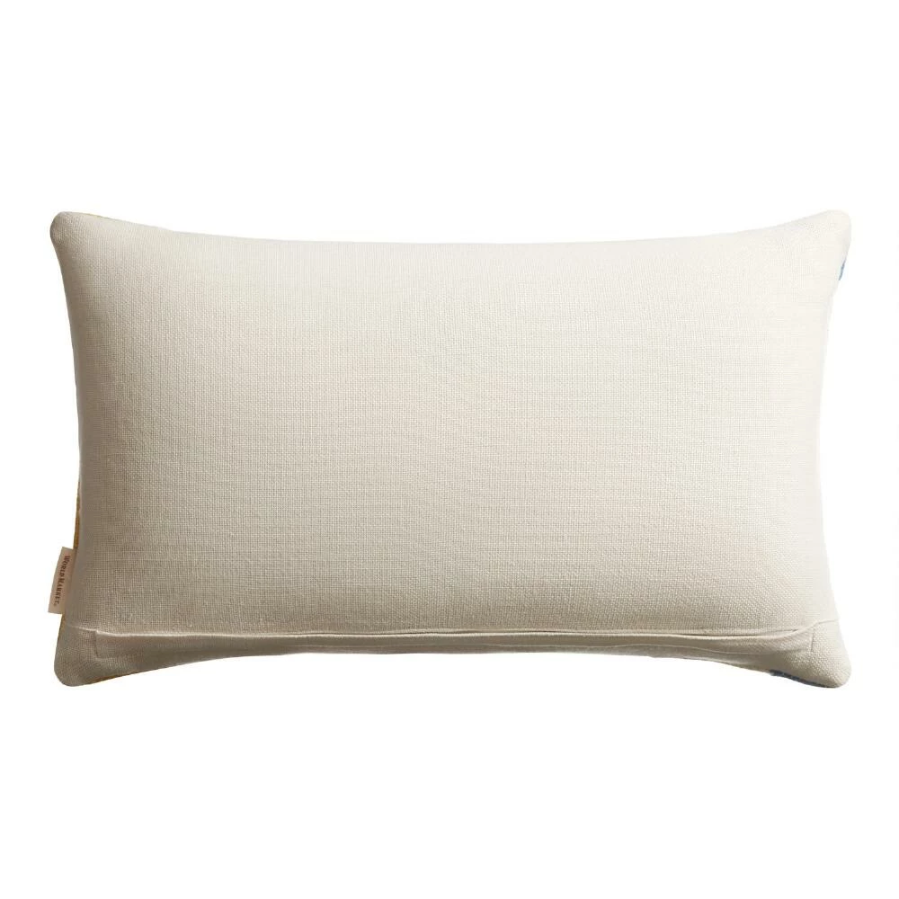 Modern geometric design and a hot Baja-inspired color palette give this indoor-outdoor woven lumbar pillow a chic Mexican-resort vibe. Finished with a solid ivory back, it’s made with an innovative process that puts recycled water bottles to good use. Add it to your cushion lineup in your lounge or outside on your patio for an instant boost of summertime energy that gives your space a subtle well-traveled ambience.