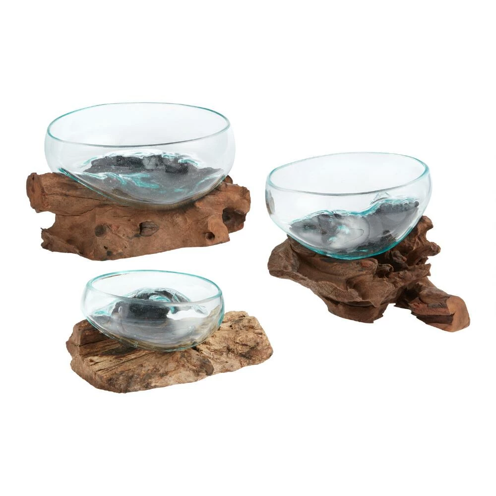 Crafted of hand-blown glass molded to the shape of the natural driftwood below it, our striking bowl decor lends your display a fluid, organic feel. Available in a range of sizes, each piece is entirely unique.