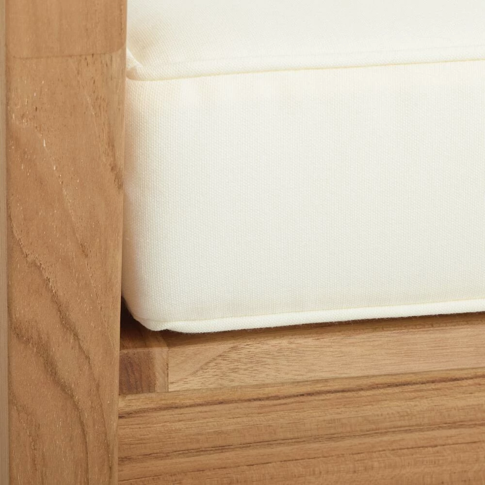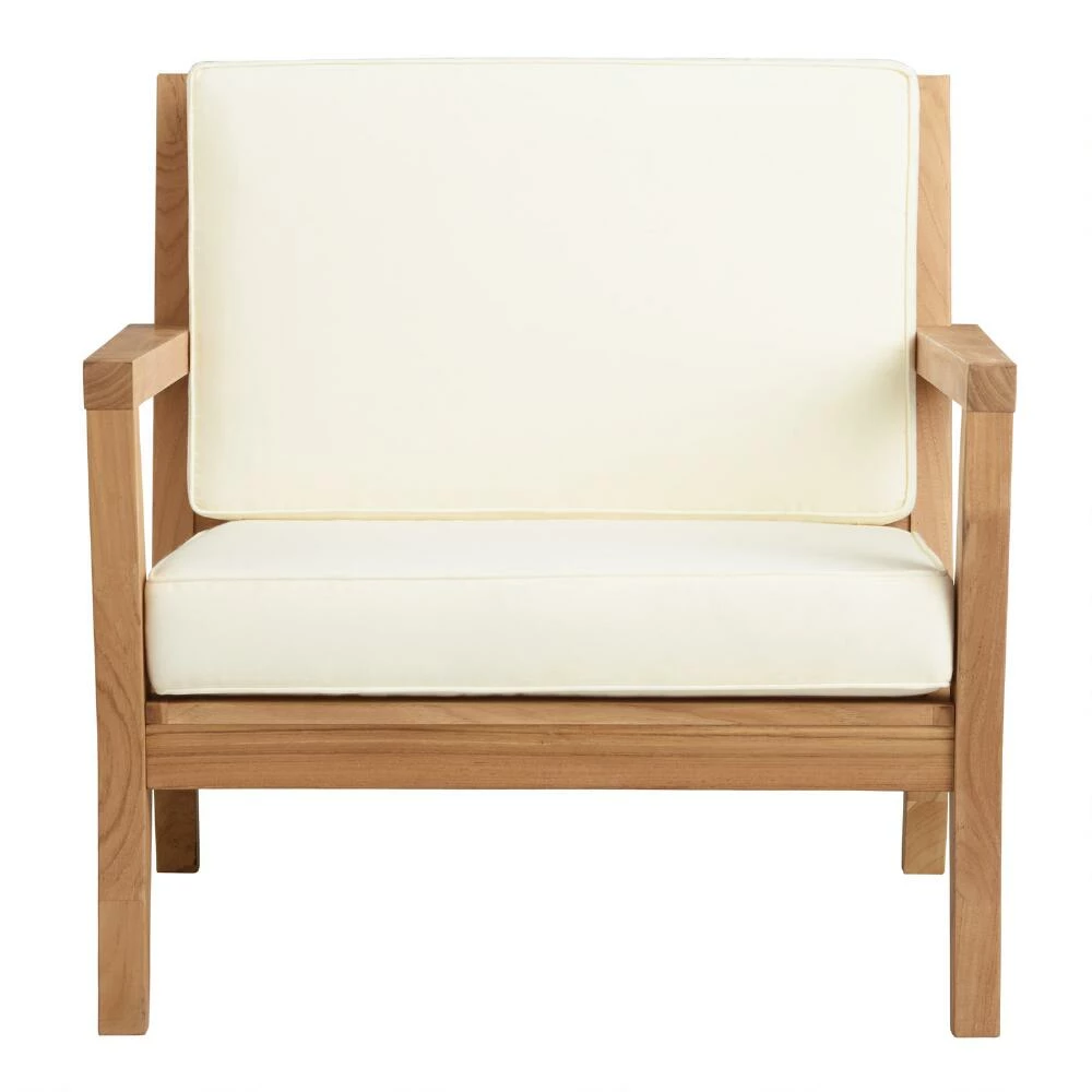 Made of sturdy, plantation-grown teak in an understated design, this outdoor chair makes it easy to kick back and enjoy your backyard with friends and family. A casual patio armchair that’s built for comfort, it offers solid craftmanship in a natural finish and soft, weather-resistant cushions in antique white.