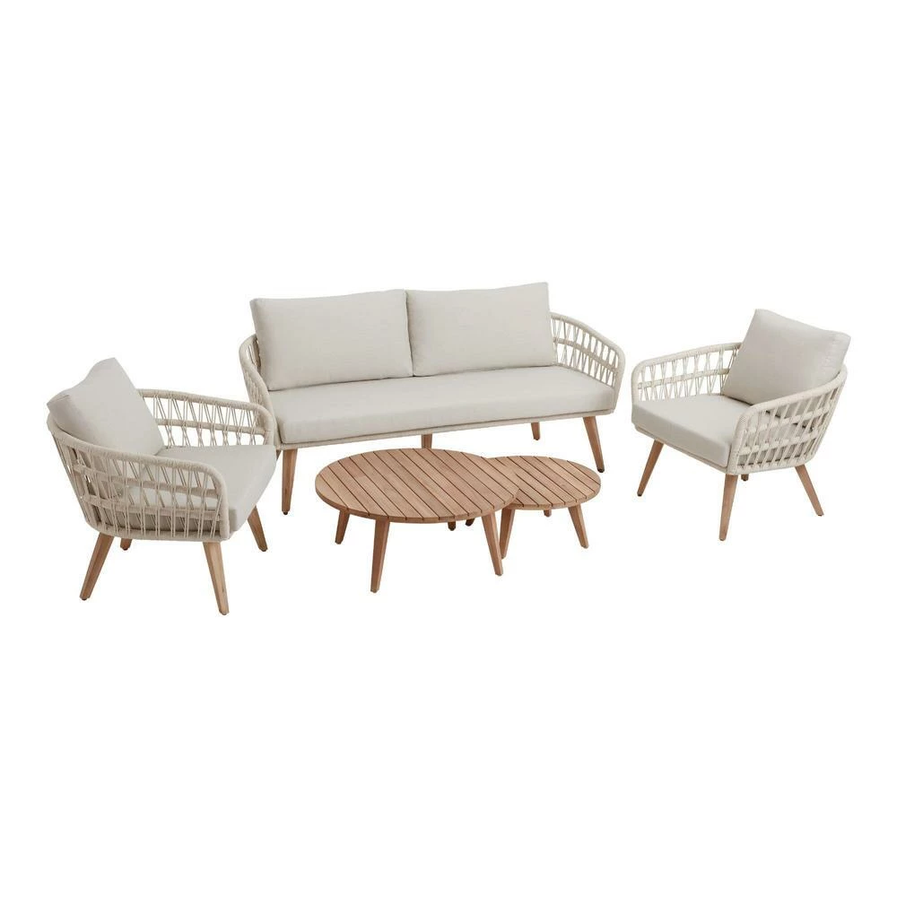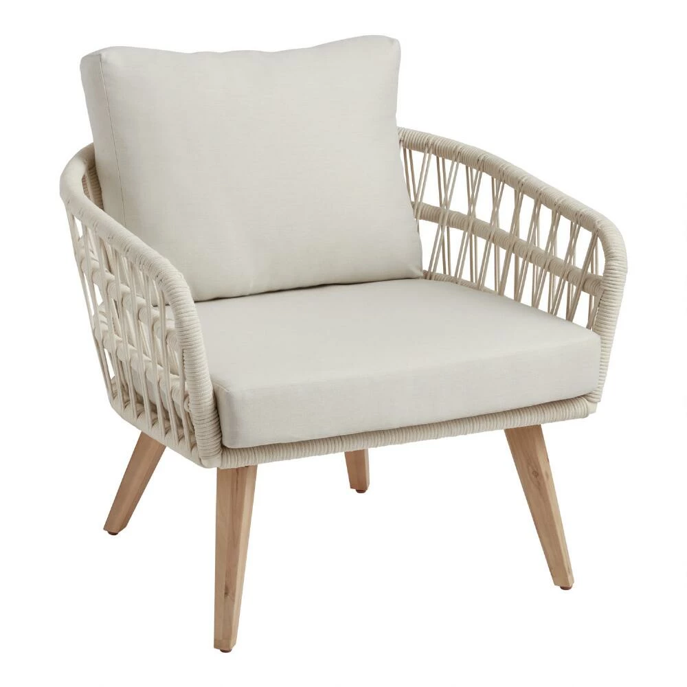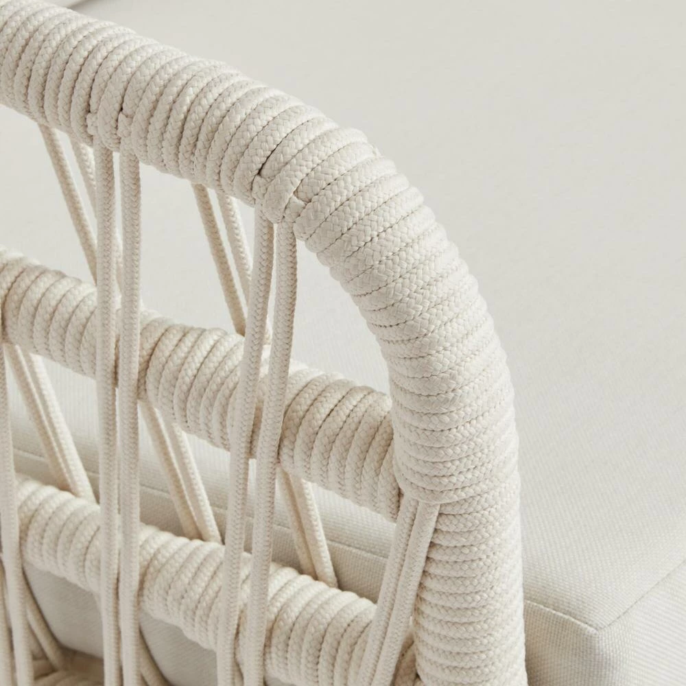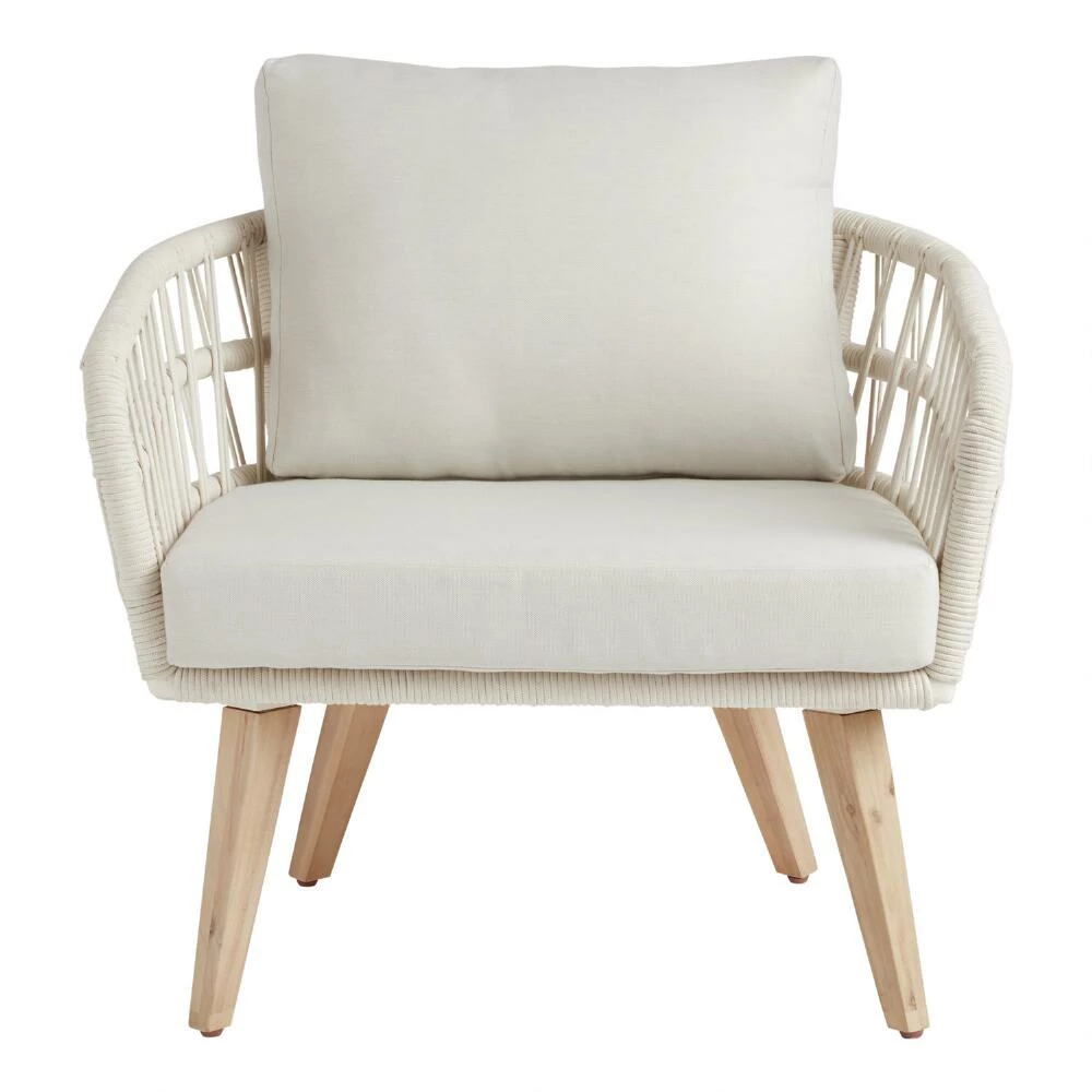 Set a modern yet laid-back tone for your balcony, patio or porch with our exclusive Nevis outdoor chair. Durable acacia wood is hewn into flared legs and finished in a light natural tone, while antique-white nautical rope is woven in a crisscrossing pattern for the chair’s seat and back. Topped with plush cushions in antique white, we adore this patio chair paired with our other Nevis outdoor furniture to create a dreamy alfresco haven.