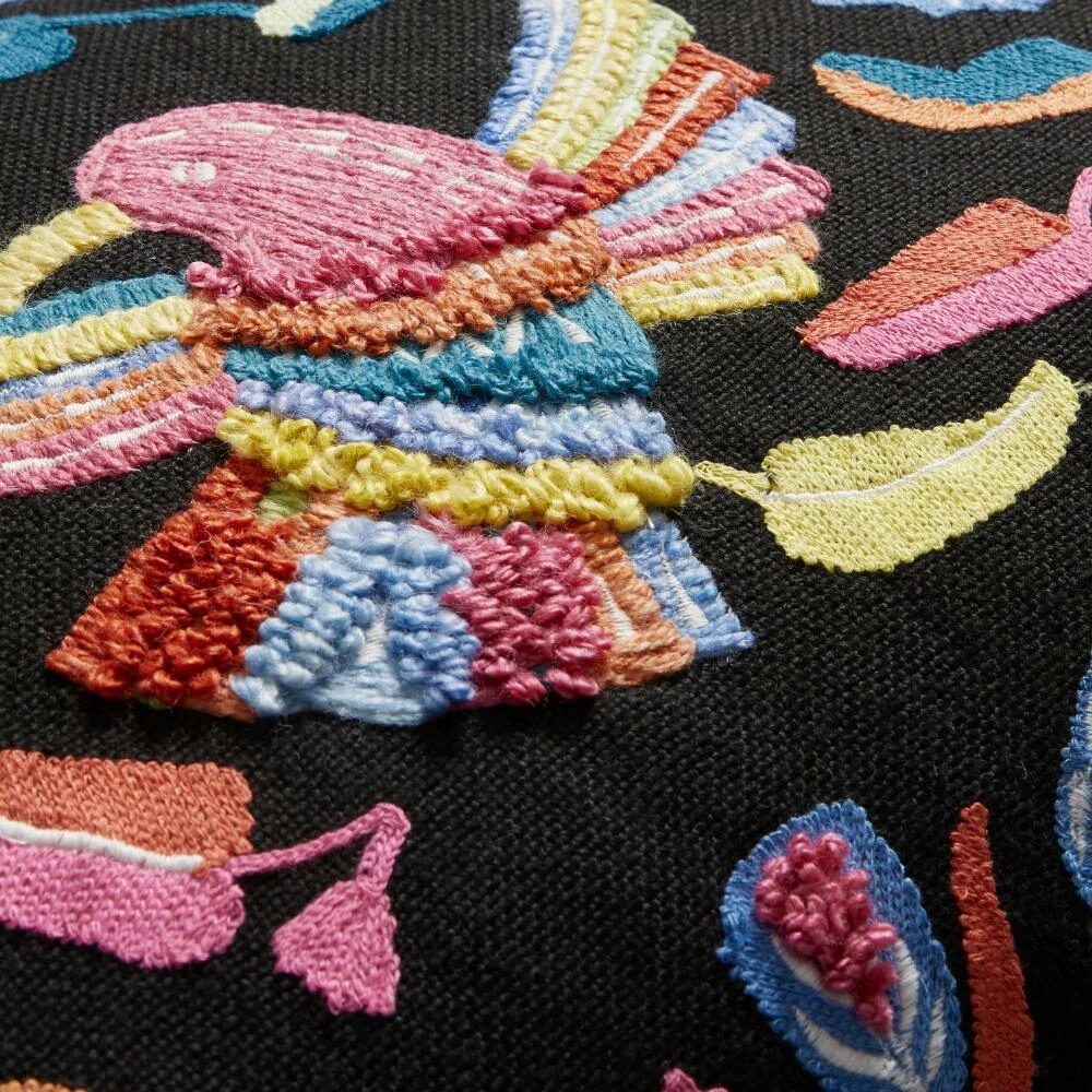 Taking the vibrantly colored architecture of Oaxaca for inspiration, our embroidered throw pillow represents the Mexican city’s rich legacy of arts and crafts. A striking addition to any sofa or chair, indoors or outside, it’s made with an innovative process that puts recycled water bottles to good use. Our exclusive rainbow design depicts a lively flapping bird surrounded by leaves and flowers on a bold black ground.