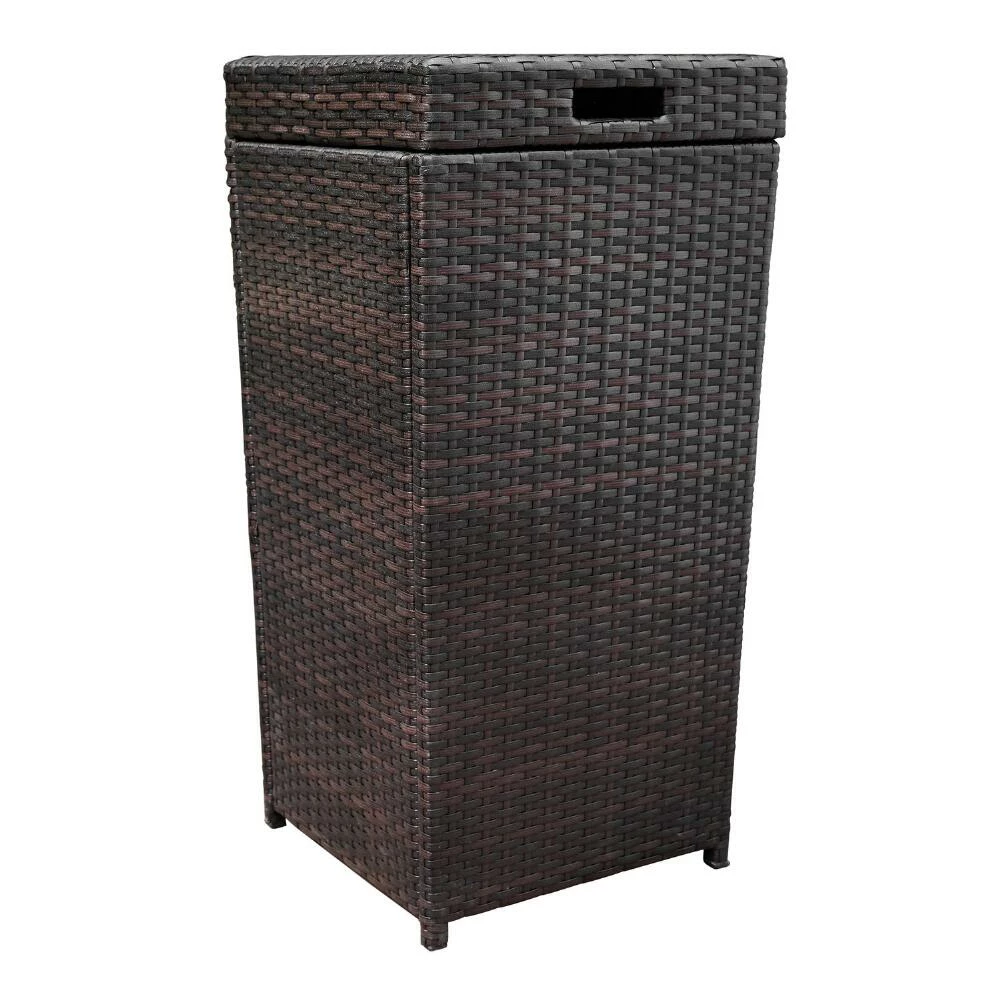 Our modern trash bin boasts a UV-resistant steel frame intricately woven with resin wicker in an espresso hue. This versatile piece can be used as a hamper for damp towels near the pool or as a trash can to keep your patio clean and tidy.