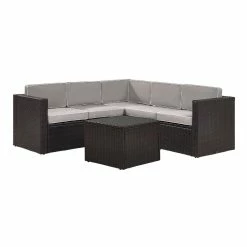 The Pinamar modular outdoor sectional sofa set offers an array of configurations to suit your backyard space. Each patio piece is made with a steel frame intricately woven with all-weather wicker in a deep espresso finish and topped with neutral gray fade-resistant cushions. Including a coffee table, this complete furniture set has everything you need to create a modern setting for entertaining and relaxing outdoors.