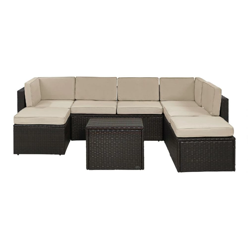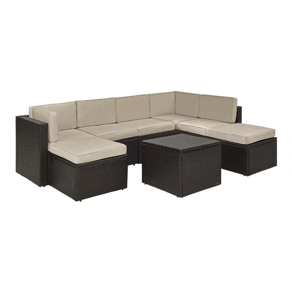 The Pinamar modular outdoor sectional sofa set offers an array of configurations to suit your backyard space. Each patio piece is made with a steel frame intricately woven with all-weather wicker in a deep espresso finish and topped by neutral fade-resistant cushions. Including corner chairs, center chairs, ottomans and a coffee table, this furniture set has everything you need to create a modern setting for entertaining and relaxing outdoors.