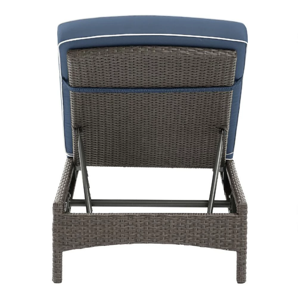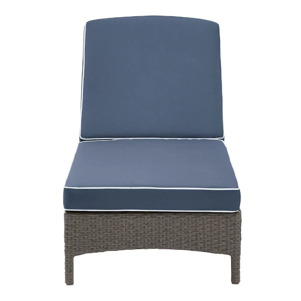 The Pinamar outdoor chaise lounge chair offers a perfect spot to relax in your backyard space. This patio lounger boasts a UV-resistant steel frame intricately woven with resin wicker in a weathered gray hue and navy blue moisture-resistant cushion. A sophisticated and modern outdoor seat, it features an adjustable back for maximum comfort while unwinding on the deck or next to the pool.