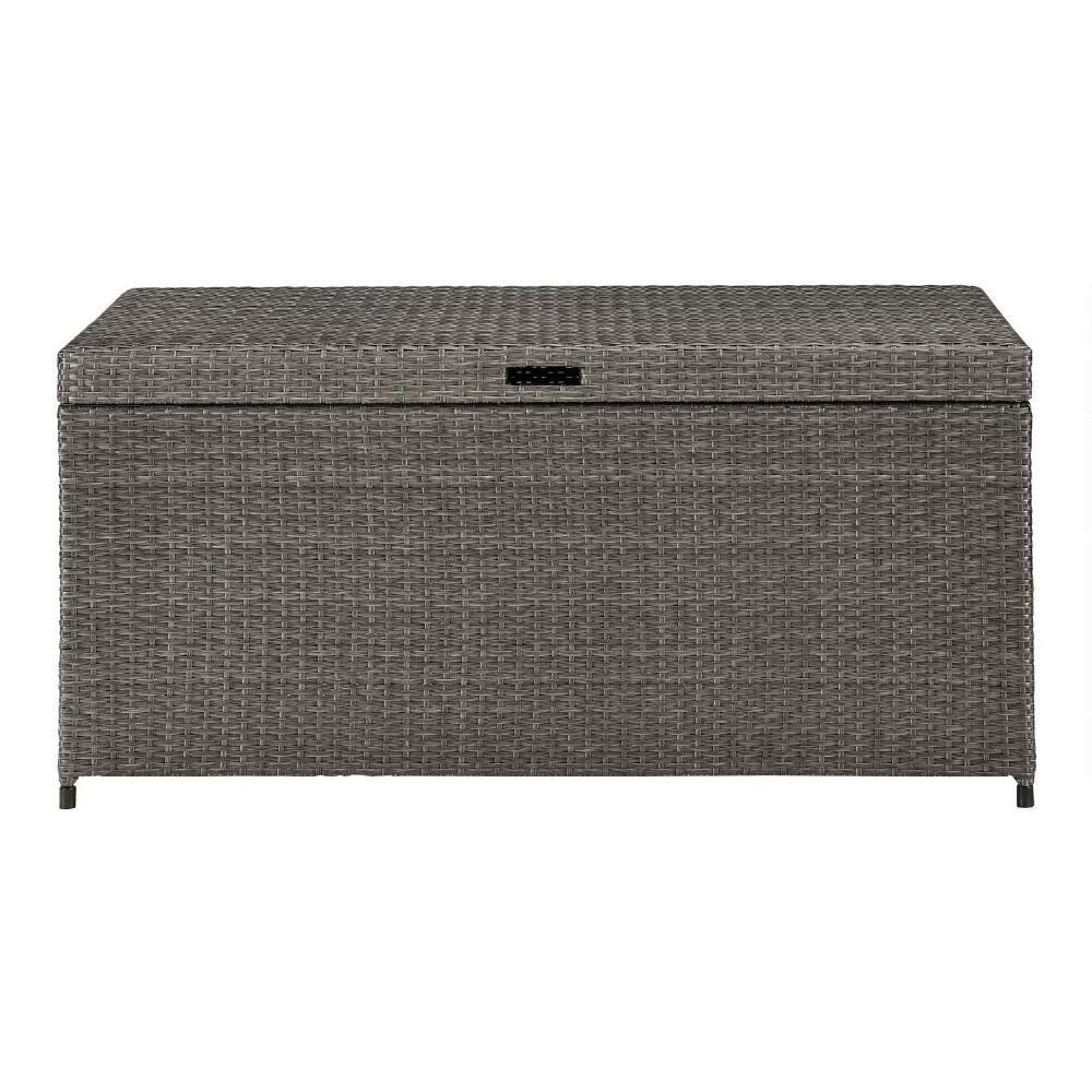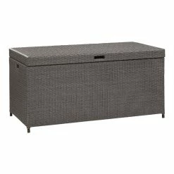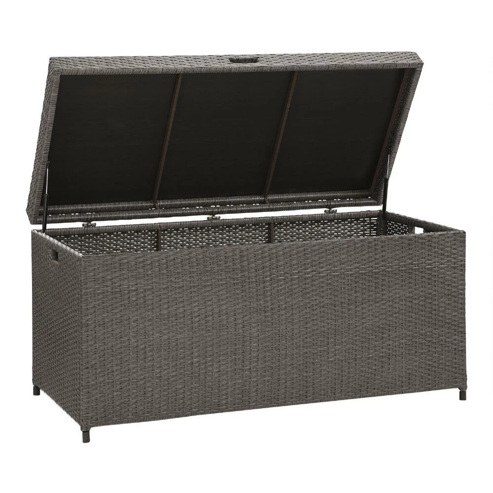 Handwoven with all-weather resin wicker in a weathered gray hue, the Pinamar patio storage chest opens to reveal a wealth of interior storage space. Sophisticated and modern with a durable steel frame, it keeps your backyard essentials organized and protected. Large enough to hold our square outdoor cushions in addition to tools, toys and necessities, this upscale storage bin opens and closes smoothly with an anti-slam pneumatic hinge.
