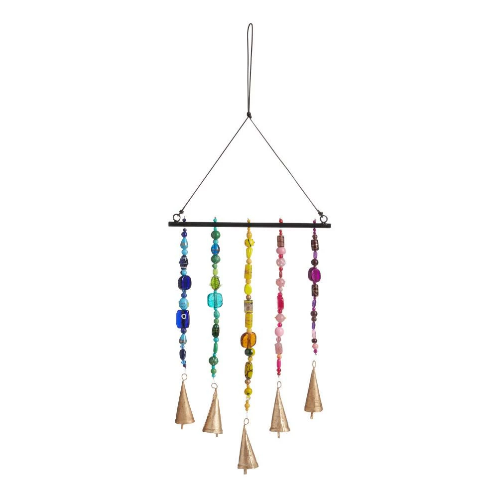 Rainbow-hued and boho-chic, our vibrant wind chime from India brings eclectic charm to your outdoor decor. Each of its five strands of glass beads is styled in a different color and finished with a cone-shaped gold bell.