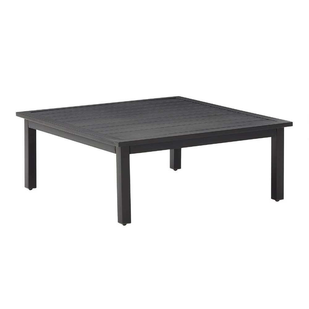 Crafted of power-coated steel in matte black, the sleek Riviera outdoor coffee table features a clean-lined profile with low legs and a square slatted surface. Weather-resistant and durable, its compact contours provide ample tabletop space for drinks and decor on small decks and balconies. Simple in style with a versatile sophistication, its modern design and classic color complement a wide variety of our patio furniture.